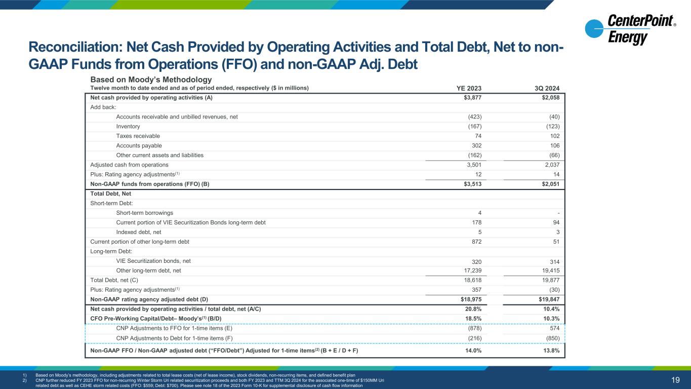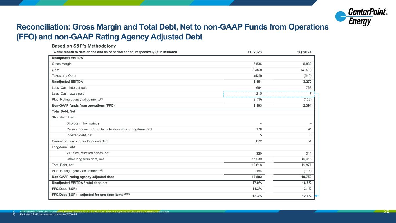 Reconciliation: Net Cash Provided by Operating Activities and Total Debt, Net to non- GAAP Funds from Operations (FFO) and non-GAAP Adj. Debt 19 aaaaaaaaa Twelve month to date ended and as of period ended, respectively ($ in millions) YE 2023 3Q 2024 Net cash provided by operating activities (A) $3,877 $2,058 Add back: Accounts receivable and unbilled revenues, net (423) (40) Inventory (167) (123) Taxes receivable 74 102 Accounts payable 302 106 Other current assets and liabilities (162) (66) Adjusted cash from operations 3,501 2,037 Plus: Rating agency adjustments(1) 12 14 Non-GAAP funds from operations (FFO) (B) $3,513 $2,051 Total Debt, Net Short-term Debt: Short-term borrowings 4 - Current portion of VIE Securitization Bonds long-term debt 178 94 Indexed debt, net 5 3 Current portion of other long-term debt 872 51 Long-term Debt: VIE Securitization bonds, net 320 314 Other long-term debt, net 17,239 19,415 Total Debt, net (C) 18,618 19,877 Plus: Rating agency adjustments(1) 357 (30) Non-GAAP rating agency adjusted debt (D) $18,975 $19,847 Net cash provided by operating activities / total debt, net (A/C) 20.8% 10.4% CFO Pre-Working Capital/Debt– Moody’s(1) (B/D) 18.5% 10.3% CNP Adjustments to FFO for 1-time items (E) (878) 574 CNP Adjustments to Debt for 1-time items (F) (216) (850) Non-GAAP FFO / Non-GAAP adjusted debt (“FFO/Debt”) Adjusted for 1-time items(2) (B + E / D + F) 14.0% 13.8% Based on Moody’s Methodology 1) Based on Moody’s methodology, including adjustments related to total lease costs (net of lease income), stock dividends, non-recurring items, and defined benefit plan 2) CNP further reduced FY 2023 FFO for non-recurring Winter Storm Uri related securitization proceeds and both FY 2023 and TTM 3Q 2024 for the associated one-time of $150MM Uri related debt as well as CEHE storm related costs (FFO: $559; Debt: $700). Please see note 18 of the 2023 Form 10-K for supplemental disclosure of cash flow information