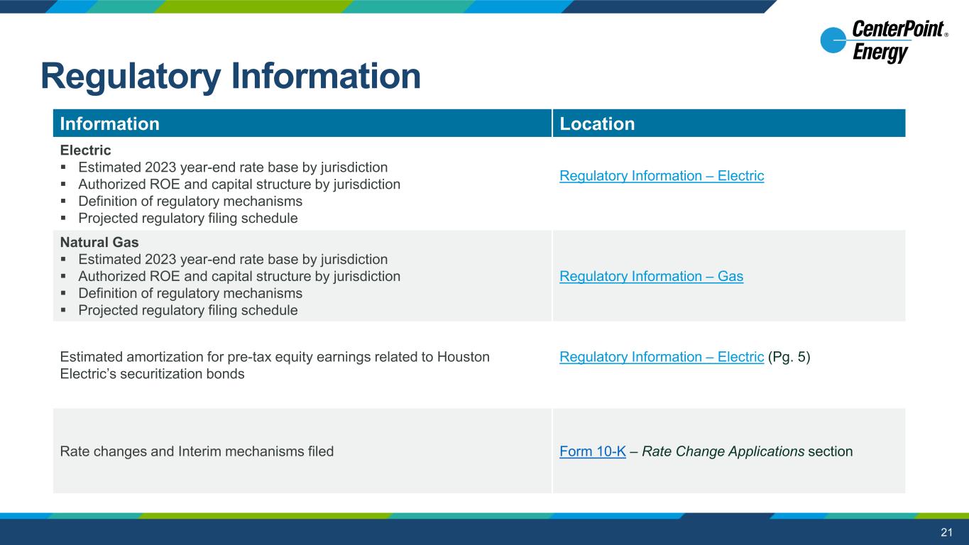 21 aaaaaaaaa Information Location Electric  Estimated 2023 year-end rate base by jurisdiction  Authorized ROE and capital structure by jurisdiction  Definition of regulatory mechanisms  Projected regulatory filing schedule Regulatory Information – Electric Natural Gas  Estimated 2023 year-end rate base by jurisdiction  Authorized ROE and capital structure by jurisdiction  Definition of regulatory mechanisms  Projected regulatory filing schedule Regulatory Information – Gas Estimated amortization for pre-tax equity earnings related to Houston Electric’s securitization bonds Regulatory Information – Electric (Pg. 5) Rate changes and Interim mechanisms filed Form 10-K – Rate Change Applications section Regulatory Information
