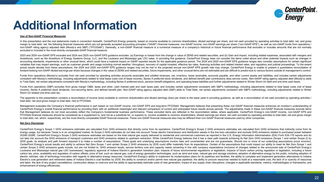 22 Use of Non-GAAP Financial Measures In this presentation and the oral statements made in connection herewith, CenterPoint Energy presents, based on income available to common shareholders, diluted earnings per share, and net cash provided by operating activities to total debt, net, and gross margin to total debt, net, the following financial measures which are not generally accepted accounting principles (“GAAP”) financial measures: non-GAAP income, non-GAAP earnings per share (“non-GAAP EPS”), as well as non-GAAP funds from operations / non-GAAP rating agency adjusted debt (Moody’s and S&P) (“FFO/Debt”). Generally, a non-GAAP financial measure is a numerical measure of a company’s historical or future financial performance that excludes or includes amounts that are not normally excluded or included in the most directly comparable GAAP financial measure. 2023 and 2024 non-GAAP EPS excluded and 2024 and 2025 non-GAAP EPS guidance excludes: (a) Earnings or losses from the change in value of ZENS and related securities, and (b) Gain and impact, including related expenses, associated with mergers and divestitures, such as the divestiture of Energy Systems Group, LLC, and the Louisiana and Mississippi gas LDC sales. In providing this guidance, CenterPoint Energy does not consider the items noted above and other potential impacts such as changes in accounting standards, impairments or other unusual items, which could have a material impact on GAAP reported results for the applicable guidance period. The 2024 and 2025 non-GAAP EPS guidance ranges also consider assumptions for certain significant variables that may impact earnings, such as customer growth and usage including normal weather, throughput, recovery of capital invested, effective tax rates, financing activities and related interest rates, and regulatory and judicial proceedings. To the extent actual results deviate from these assumptions, the 2024 and 2025 non-GAAP EPS guidance ranges may not be met or the projected annual non-GAAP EPS growth rate may change. CenterPoint Energy is unable to present a quantitative reconciliation of forward-looking non-GAAP diluted earnings per share because changes in the value of ZENS and related securities, future impairments, and other unusual items are not estimable and are difficult to predict due to various factors outside of management’s control. Funds from operations (Moody’s) excludes from net cash provided by operating activities accounts receivable and unbilled revenues, net, inventory, taxes receivable, accounts payable, and other current assets and liabilities, and includes certain adjustments consistent with Moody’s methodology, including adjustments related to total lease costs (net of lease income), Series A preferred stock dividends, and defined benefit plan contributions (less service costs). Non-GAAP rating agency adjusted debt (Moody’s) adds to Total Debt, net certain adjustments consistent with Moody’s methodology, including Series A preferred stock, pension benefit obligations, and operating lease liabilities and further adjustments related to Winter Storm Uri debt and one time cash taxes. Funds from operations (S&P) excludes from gross margin O&M, taxes and other, cash interest paid and cash taxes paid, and includes certain adjustments consistent with S&P's methodology, including adjustments related to total lease costs (net of lease income), Series A preferred stock dividends, non-recurring items, and defined benefit plan. Non-GAAP rating agency adjusted debt (S&P) adds to Total Debt, net certain adjustments consistent with S&P's methodology, including adjustments related to Winter Storm Uri related one-time cash tax. The appendix to this presentation contains a reconciliation of income (loss) available to common shareholders and diluted earnings (loss) per share to the basis used in providing guidance, as well as a reconciliation of net cash provided by operating activities / total debt, net (and gross margin to total debt, net) to FFO/Debt. Management evaluates the Company’s financial performance in part based on non-GAAP income, non-GAAP EPS and long-term FFO/Debt. Management believes that presenting these non-GAAP financial measures enhances an investor’s understanding of CenterPoint Energy’s overall financial performance by providing them with an additional meaningful and relevant comparison of current and anticipated future results across periods. The adjustments made in these non-GAAP financial measures exclude items that Management believes do not most accurately reflect the Company’s fundamental business performance. These excluded items are reflected in the reconciliation tables, where applicable. CenterPoint Energy’s non-GAAP income, non-GAAP EPS and FFO/Debt financial measures should be considered as a supplement to, and not as a substitute for, or superior to, income available to common shareholders, diluted earnings per share, net cash provided by operating activities to total debt, net and gross margin to total debt, net, which, respectively, are the most directly comparable GAAP financial measures. These non-GAAP financial measures also may be different than non-GAAP financial measures used by other companies. Net Zero Disclaimer CenterPoint Energy’s Scope 1 GHG emissions estimates are calculated from GHG emissions that directly come from its operations. CenterPoint Energy’s Scope 2 GHG emissions estimates are calculated from GHG emissions that indirectly come from its energy usage, but because Texas is in an unregulated market, its Scope 2 GHG estimates do not take into account Texas electric transmission and distribution assets in the line loss calculation and exclude GHG emissions related to purchased power between 2024E-2026E. CenterPoint Energy’s Scope 3 GHG emissions estimates are based on the total natural gas supply delivered to residential and commercial customers as reported in the U.S. Energy Information Adm