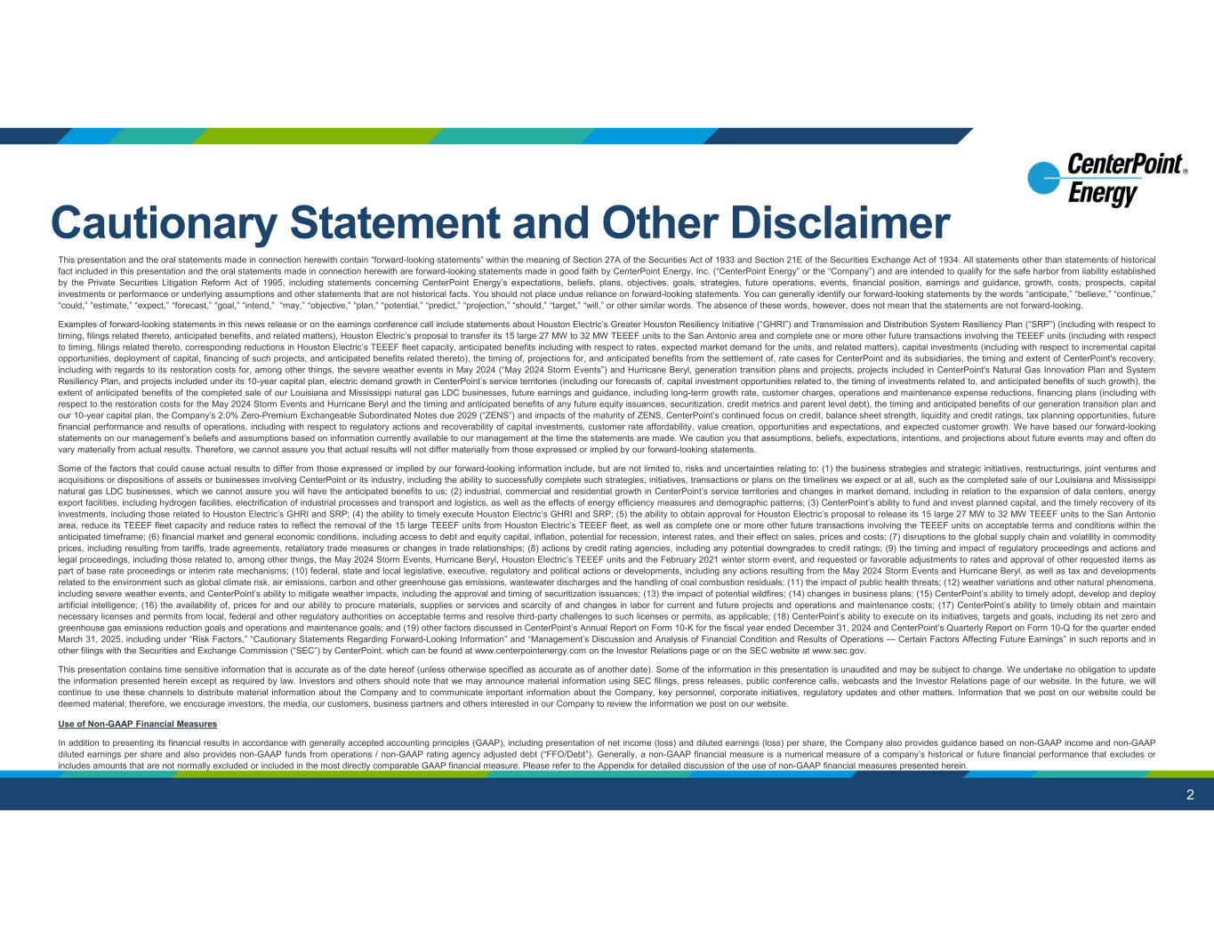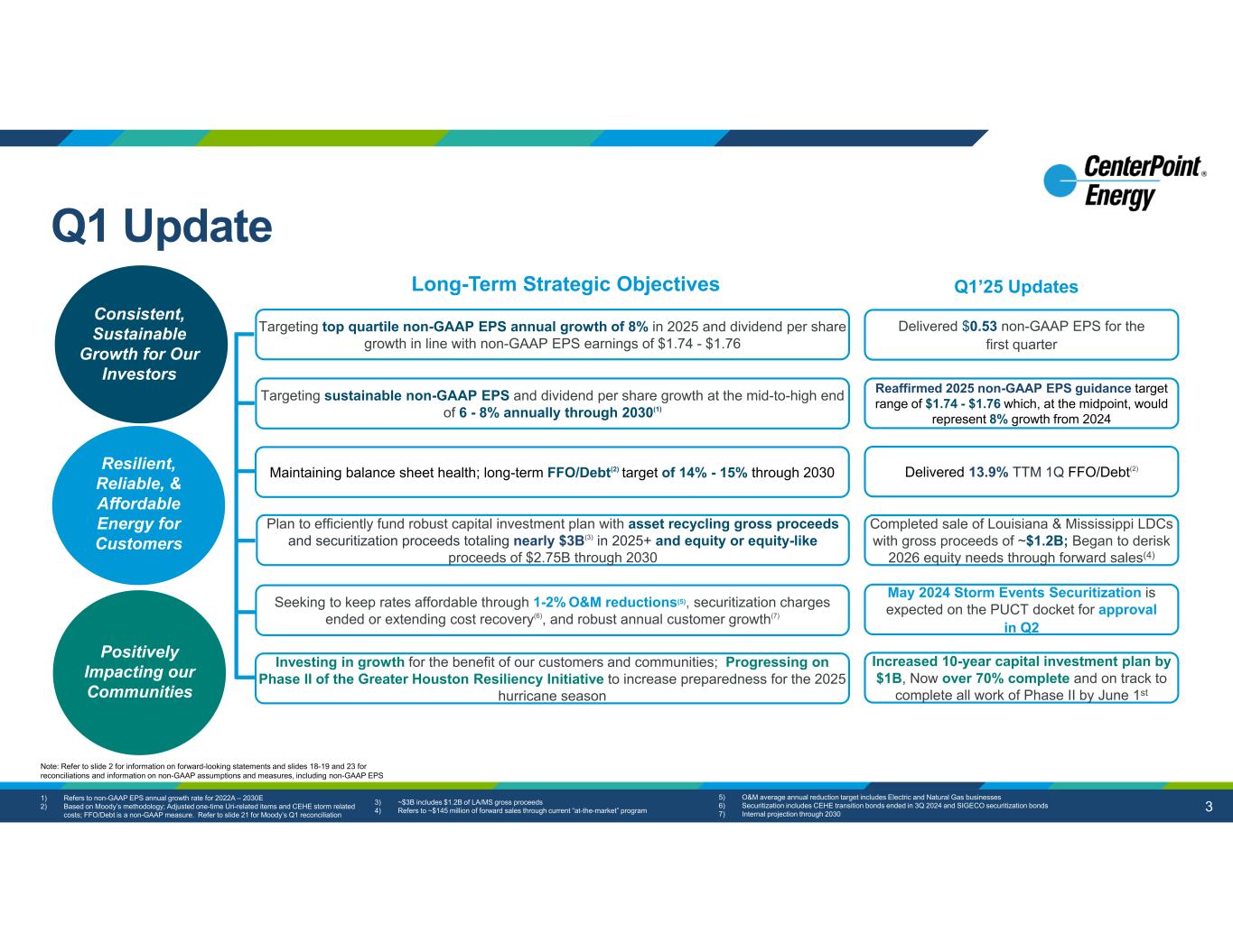 2 This presentation and the oral statements made in connection herewith contain “forward-looking statements” within the meaning of Section 27A of the Securities Act of 1933 and Section 21E of the Securities Exchange Act of 1934. All statements other than statements of historical fact included in this presentation and the oral statements made in connection herewith are forward-looking statements made in good faith by CenterPoint Energy, Inc. (“CenterPoint Energy” or the “Company”) and are intended to qualify for the safe harbor from liability established by the Private Securities Litigation Reform Act of 1995, including statements concerning CenterPoint Energy’s expectations, beliefs, plans, objectives, goals, strategies, future operations, events, financial position, earnings and guidance, growth, costs, prospects, capital investments or performance or underlying assumptions and other statements that are not historical facts. You should not place undue reliance on forward-looking statements. You can generally identify our forward-looking statements by the words “anticipate,” “believe,” “continue,” “could,” “estimate,” “expect,” “forecast,” “goal,” “intend,” “may,” “objective,” “plan,” “potential,” “predict,” “projection,” “should,” “target,” “will,” or other similar words. The absence of these words, however, does not mean that the statements are not forward-looking. Examples of forward-looking statements in this news release or on the earnings conference call include statements about Houston Electric’s Greater Houston Resiliency Initiative (“GHRI”) and Transmission and Distribution System Resiliency Plan (“SRP”) (including with respect to timing, filings related thereto, anticipated benefits, and related matters), Houston Electric’s proposal to transfer its 15 large 27 MW to 32 MW TEEEF units to the San Antonio area and complete one or more other future transactions involving the TEEEF units (including with respect to timing, filings related thereto, corresponding reductions in Houston Electric’s TEEEF fleet capacity, anticipated benefits including with respect to rates, expected market demand for the units, and related matters), capital investments (including with respect to incremental capital opportunities, deployment of capital, financing of such projects, and anticipated benefits related thereto), the timing of, projections for, and anticipated benefits from the settlement of, rate cases for CenterPoint and its subsidiaries, the timing and extent of CenterPoint's recovery, including with regards to its restoration costs for, among other things, the severe weather events in May 2024 (“May 2024 Storm Events”) and Hurricane Beryl, generation transition plans and projects, projects included in CenterPoint's Natural Gas Innovation Plan and System Resiliency Plan, and projects included under its 10-year capital plan, electric demand growth in CenterPoint’s service territories (including our forecasts of, capital investment opportunities related to, the timing of investments related to, and anticipated benefits of such growth), the extent of anticipated benefits of the completed sale of our Louisiana and Mississippi natural gas LDC businesses, future earnings and guidance, including long-term growth rate, customer charges, operations and maintenance expense reductions, financing plans (including with respect to the restoration costs for the May 2024 Storm Events and Hurricane Beryl and the timing and anticipated benefits of any future equity issuances, securitization, credit metrics and parent level debt), the timing and anticipated benefits of our generation transition plan and our 10-year capital plan, the Company’s 2.0% Zero-Premium Exchangeable Subordinated Notes due 2029 (“ZENS”) and impacts of the maturity of ZENS, CenterPoint’s continued focus on credit, balance sheet strength, liquidity and credit ratings, tax planning opportunities, future financial performance and results of operations, including with respect to regulatory actions and recoverability of capital investments, customer rate affordability, value creation, opportunities and expectations, and expected customer growth. We have based our forward-looking statements on our management’s beliefs and assumptions based on information currently available to our management at the time the statements are made. We caution you that assumptions, beliefs, expectations, intentions, and projections about future events may and often do vary materially from actual results. Therefore, we cannot assure you that actual results will not differ materially from those expressed or implied by our forward-looking statements. Some of the factors that could cause actual results to differ from those expressed or implied by our forward-looking information include, but are not limited to, risks and uncertainties relating to: (1) the business strategies and strategic initiatives, restructurings, joint ventures and acquisitions or dispositions of assets or businesses involving CenterPoint or its industry, including the ability to successfully complete such strategies, initiatives, transactions or plans on the timelines we expect or at all, such as the completed sale of our Louisiana and Mississippi natural gas LDC businesses, which we cannot assure you will have the anticipated benefits to us; (2) industrial, commercial and residential growth in CenterPoint’s service territories and changes in market demand, including in relation to the expansion of data centers, energy export facilities, including hydrogen facilities, electrification of industrial processes and transport and logistics, as well as the effects of energy efficiency measures and demographic patterns; (3) CenterPoint’s ability to fund and invest planned capital, and the timely recovery of its investments, including those related to Houston Electric’s GHRI and SRP; (4) th