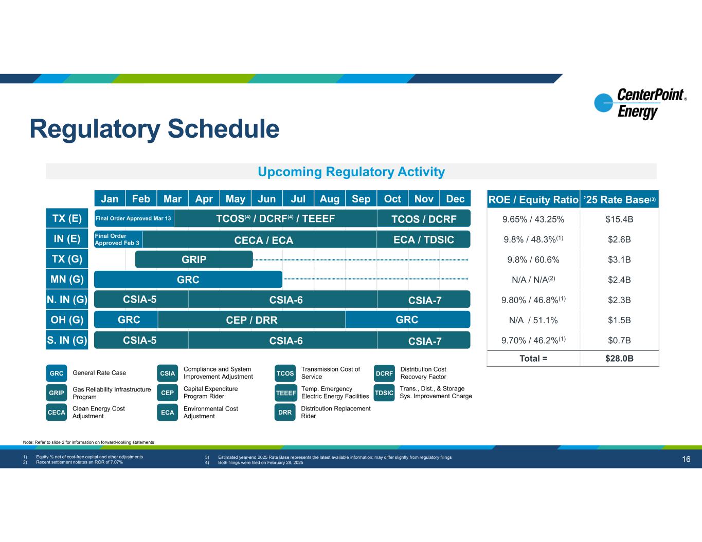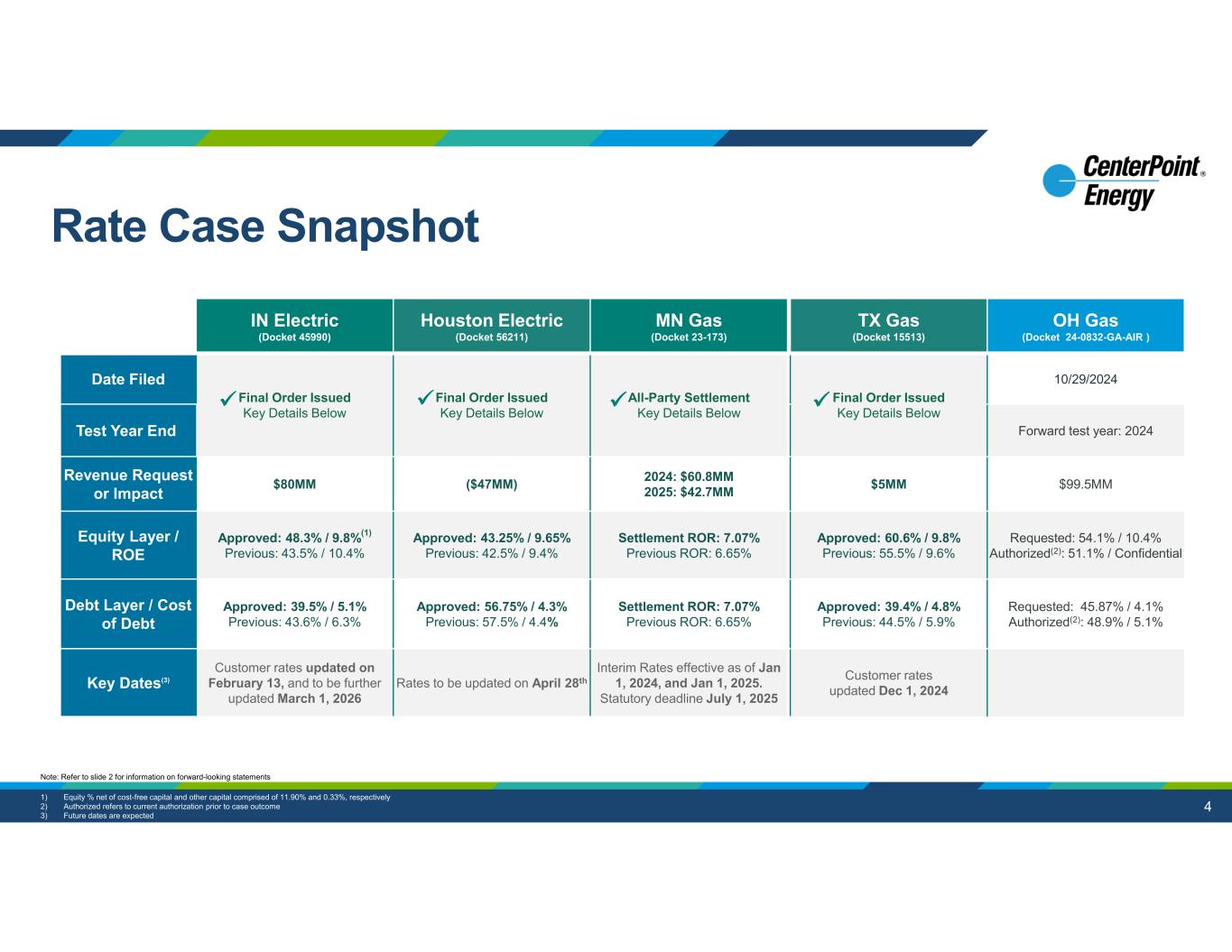 4 OH Gas (Docket 24-0832-GA-AIR ) TX Gas (Docket 15513) MN Gas (Docket 23-173) Houston Electric (Docket 56211) IN Electric (Docket 45990) 10/29/2024 Final Order Issued Key Details Below All-Party Settlement Key Details Below Final Order Issued Key Details Below Final Order Issued Key Details Below Date Filed Forward test year: 2024Test Year End $99.5MM$5MM2024: $60.8MM 2025: $42.7MM($47MM)$80MMRevenue Request or Impact Requested: 54.1% / 10.4% Authorized(2): 51.1% / Confidential Approved: 60.6% / 9.8% Previous: 55.5% / 9.6% Settlement ROR: 7.07% Previous ROR: 6.65% Approved: 43.25% / 9.65% Previous: 42.5% / 9.4% Approved: 48.3% / 9.8%(1) Previous: 43.5% / 10.4% Equity Layer / ROE Requested: 45.87% / 4.1% Authorized(2): 48.9% / 5.1% Approved: 39.4% / 4.8% Previous: 44.5% / 5.9% Settlement ROR: 7.07% Previous ROR: 6.65% Approved: 56.75% / 4.3% Previous: 57.5% / 4.4% Approved: 39.5% / 5.1% Previous: 43.6% / 6.3% Debt Layer / Cost of Debt Customer rates updated Dec 1, 2024 Interim Rates effective as of Jan 1, 2024, and Jan 1, 2025. Statutory deadline July 1, 2025 Rates to be updated on April 28th Customer rates updated on February 13, and to be further updated March 1, 2026 Key Dates(3) 1) Equity % net of cost-free capital and other capital comprised of 11.90% and 0.33%, respectively 2) Authorized refers to current authorization prior to case outcome 3) Future dates are expected Note: Refer to slide 2 for information on forward-looking statements Rate Case Snapshot    