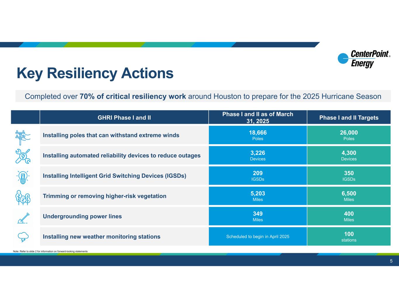 Phase I and II TargetsPhase I and II as of March 31, 2025GHRI Phase I and II 26,000 Poles 18,666 PolesInstalling poles that can withstand extreme winds 4,300 Devices 3,226 DevicesInstalling automated reliability devices to reduce outages 350 IGSDs 209 IGSDsInstalling Intelligent Grid Switching Devices (IGSDs) 6,500 Miles 5,203 MilesTrimming or removing higher-risk vegetation 400 Miles 349 MilesUndergrounding power lines 100 stations Scheduled to begin in April 2025Installing new weather monitoring stations 5 Completed over 70% of critical resiliency work around Houston to prepare for the 2025 Hurricane Season Key Resiliency Actions Note: Refer to slide 2 for information on forward-looking statements