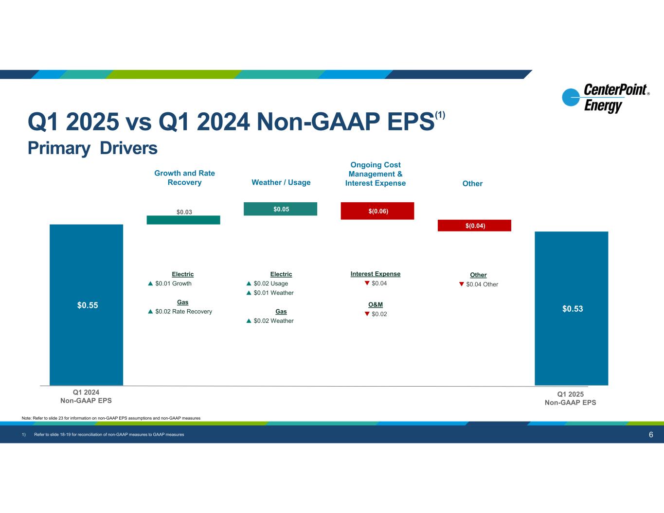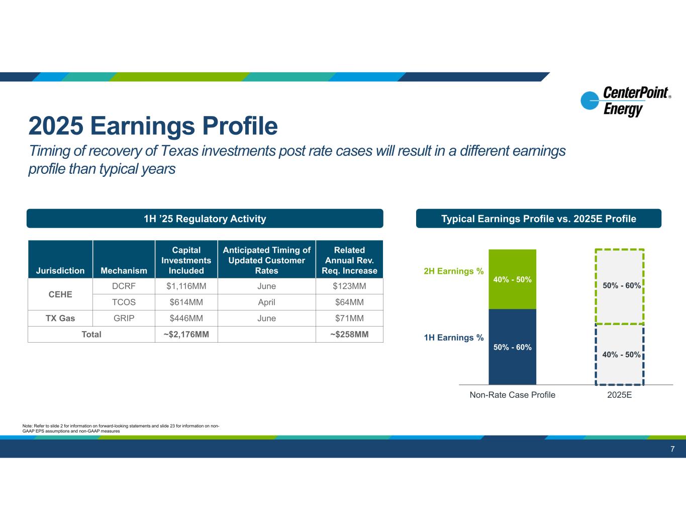 6 Q1 2024 Non-GAAP EPS Q1 2025 Non-GAAP EPS $0.50 Growth and Rate Recovery Ongoing Cost Management & Interest ExpenseWeather / Usage Other $0.05 $(0.06) $(0.04) $0.55 $0.03 $0.53 Electric  $0.01 Growth Gas  $0.02 Rate Recovery Interest Expense  $0.04 O&M  $0.02 Other  $0.04 Other ($0.06) 1) Refer to slide 18-19 for reconciliation of non-GAAP measures to GAAP measures Note: Refer to slide 23 for information on non-GAAP EPS assumptions and non-GAAP measures Q1 2025 vs Q1 2024 Non-GAAP EPS(1) Primary Drivers Electric  $0.02 Usage  $0.01 Weather Gas  $0.02 Weather