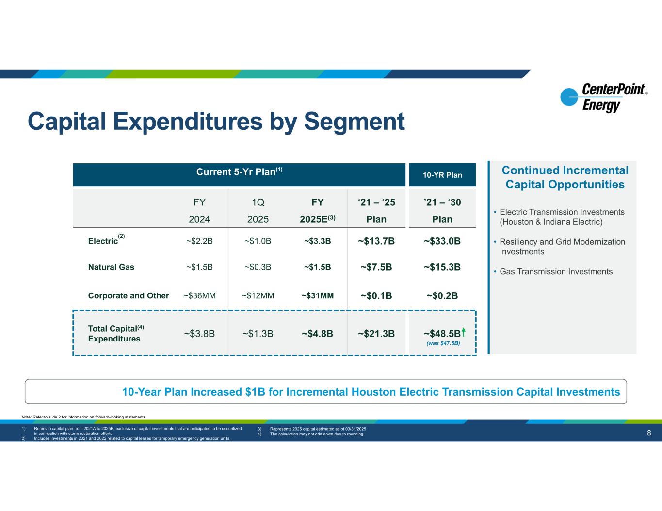 7 2025 Earnings Profile Timing of recovery of Texas investments post rate cases will result in a different earnings profile than typical years 50% - 60% 40% - 50% 40% - 50% 50% - 60% Non-Rate Case Profile 2025E Typical Earnings Profile vs. 2025E Profile 2H Earnings % 1H Earnings % Note: Refer to slide 2 for information on forward-looking statements and slide 23 for information on non- GAAP EPS assumptions and non-GAAP measures Related Annual Rev. Req. Increase Anticipated Timing of Updated Customer Rates Capital Investments Included MechanismJurisdiction $123MMJune$1,116MMDCRF CEHE $64MMApril$614MMTCOS $71MMJune$446MMGRIPTX Gas ~$258MM~$2,176MMTotal 1H ’25 Regulatory Activity