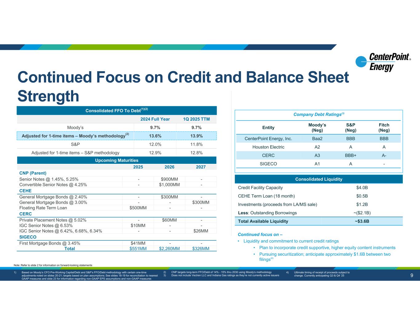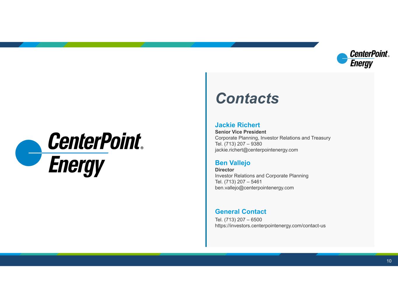 9 Fitch (Neg) S&P (Neg) Moody’s (Neg)Entity BBBBBBBaa2CenterPoint Energy, Inc. AAA2Houston Electric A-BBB+A3CERC -AA1SIGECO Company Debt Ratings(3) Consolidated FFO To Debt(1)(2) 1Q 2025 TTM2024 Full Year 9.7%9.7%Moody’s 13.9%13.6%Adjusted for 1-time items – Moody’s methodology(2) 11.8%12.0%S&P 12.8%12.9%Adjusted for 1-time items – S&P methodology Continued focus on – • Liquidity and commitment to current credit ratings • Plan to incorporate credit supportive, higher equity content instruments • Pursuing securitization; anticipate approximately $1.6B between two filings(4) Upcoming Maturities 202720262025 CNP (Parent) -$900MM-Senior Notes @ 1.45%, 5.25% -$1,000MM-Convertible Senior Notes @ 4.25% CEHE -$300MM-General Mortgage Bonds @ 2.40% $300MM--General Mortgage Bonds @ 3.00% --$500MMFloating Rate Term Loan CERC -$60MM-Private Placement Notes @ 5.02% --$10MMIGC Senior Notes @ 6.53% $26MM--IGC Senior Notes @ 6.42%, 6.68%, 6.34% SIGECO --$41MMFirst Mortgage Bonds @ 3.45% $326MM$2,260MM$551MMTotal Consolidated Liquidity $4.0BCredit Facility Capacity $0.5BCEHE Term Loan (18 month) $1.2BInvestments (proceeds from LA/MS sale) ~($2.1B)Less: Outstanding Borrowings ~$3.6BTotal Available Liquidity 1) Based on Moody’s CFO Pre-Working Capital/Debt and S&P’s FFO/Debt methodology with certain one-time adjustments noted on slides 20-21; targets based on plan assumptions; See slides 18-19 for reconciliation to nearest GAAP measures and slide 23 for information regarding non-GAAP EPS assumptions and non-GAAP measures 2) CNP targets long-term FFO/Debt of 14% - 15% thru 2030 using Moody’s methodology 3) Does not include Vectren LLC and Indiana Gas ratings as they’re not currently active issuers Note: Refer to slide 2 for information on forward-looking statements Continued Focus on Credit and Balance Sheet Strength 4) Ultimate timing of receipt of proceeds subject to change. Currently anticipating Q3 & Q4 ‘25