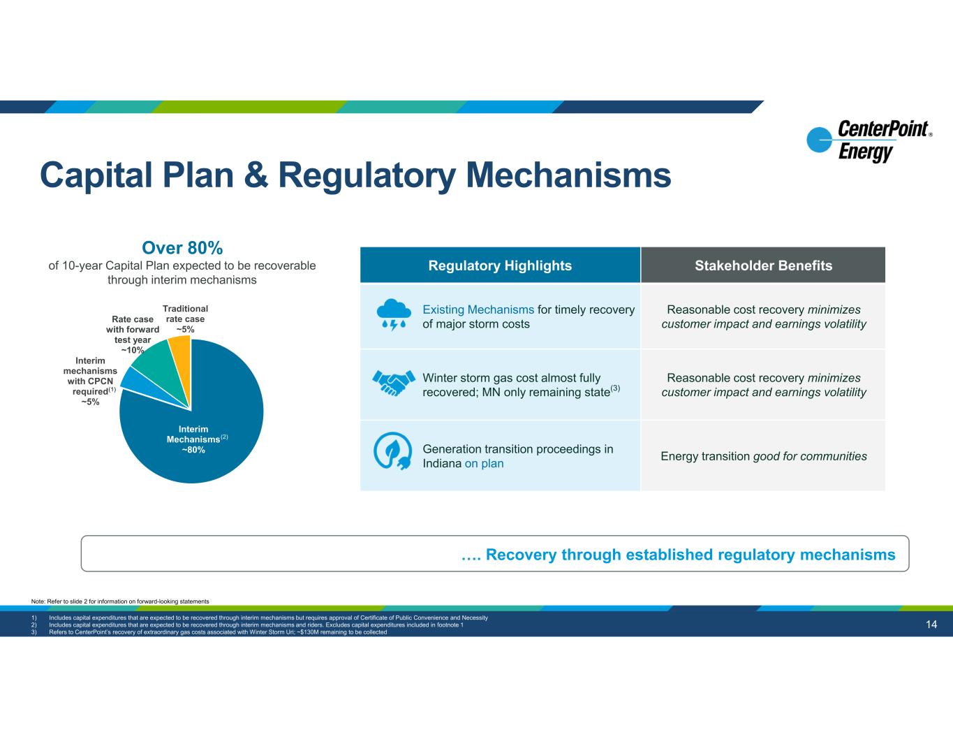 14 Stakeholder BenefitsRegulatory Highlights Reasonable cost recovery minimizes customer impact and earnings volatility Existing Mechanisms for timely recovery of major storm costs Reasonable cost recovery minimizes customer impact and earnings volatility Winter storm gas cost almost fully recovered; MN only remaining state(3) Energy transition good for communitiesGeneration transition proceedings in Indiana on plan Over 80% of 10-year Capital Plan expected to be recoverable through interim mechanisms (2) (2) Interim Mechanisms ~80% Interim mechanisms with CPCN required ~5% Rate case with forward test year ~10% Traditional rate case ~5% (1) (2) 1) Includes capital expenditures that are expected to be recovered through interim mechanisms but requires approval of Certificate of Public Convenience and Necessity 2) Includes capital expenditures that are expected to be recovered through interim mechanisms and riders. Excludes capital expenditures included in footnote 1 3) Refers to CenterPoint’s recovery of extraordinary gas costs associated with Winter Storm Uri; ~$130M remaining to be collected Note: Refer to slide 2 for information on forward-looking statements …. Recovery through established regulatory mechanisms Capital Plan & Regulatory Mechanisms