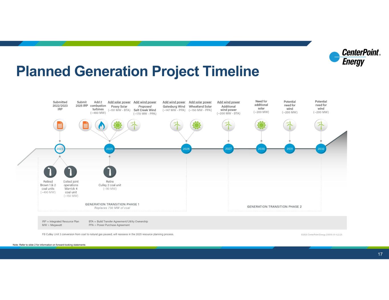 16 DecNovOctSepAugJulJunMayAprMarFebJan TX (E) IN (E) TX (G) MN (G) N. IN (G) OH (G) S. IN (G) ’25 Rate Base(3)ROE / Equity Ratio $15.4B9.65% / 43.25% $2.6B9.8% / 48.3%(1) $3.1B9.8% / 60.6% $2.4BN/A / N/A(2) $2.3B9.80% / 46.8%(1) $1.5BN/A / 51.1% $0.7B9.70% / 46.2%(1) $28.0BTotal = Upcoming Regulatory Activity CSIA-5 GRC GRC General Rate Case Final Order Approved Feb 3 Settlement filed April 23 Final Order Approved Mar 13 1) Equity % net of cost-free capital and other adjustments 2) Recent settlement notates an ROR of 7.07% Note: Refer to slide 2 for information on forward-looking statements Regulatory Schedule GRIP Gas Reliability Infrastructure Program CSIA Compliance and System Improvement Adjustment CEP Capital Expenditure Program Rider GRIP CSIA-6 CSIA-7 CSIA-5 CSIA-6 CSIA-7 TCOS Transmission Cost of Service TEEEF Temp. Emergency Electric Energy Facilities DCRF Distribution Cost Recovery Factor TDSIC Trans., Dist., & Storage Sys. Improvement Charge CECA Clean Energy Cost Adjustment ECA Environmental Cost Adjustment TCOS / DCRFTCOS(4) / DCRF(4) / TEEEF CECA / ECA ECA / TDSIC 3) Estimated year-end 2025 Rate Base represents the latest available information; may differ slightly from regulatory filings 4) Both filings were filed on February 28, 2025 GRC GRC CEP / DRR DRR Distribution Replacement Rider