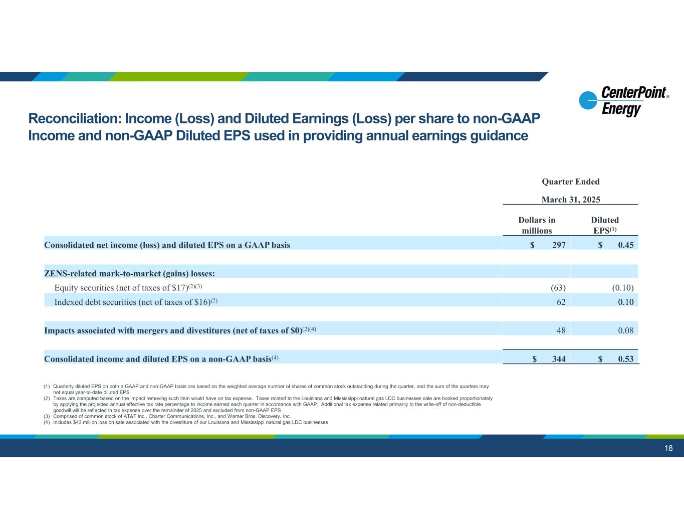 18 aaaaaaaaa Quarter Ended March 31, 2025 Diluted EPS(1) Dollars in millions $ 0.45$ 297Consolidated net income (loss) and diluted EPS on a GAAP basis ZENS-related mark-to-market (gains) losses: (0.10)(63)Equity securities (net of taxes of $17)(2)(3) 0.1062Indexed debt securities (net of taxes of $16)(2) 0.0848Impacts associated with mergers and divestitures (net of taxes of $0)(2)(4) $ 0.53$ 344Consolidated income and diluted EPS on a non-GAAP basis(4) (1) Quarterly diluted EPS on both a GAAP and non-GAAP basis are based on the weighted average number of shares of common stock outstanding during the quarter, and the sum of the quarters may not equal year-to-date diluted EPS (2) Taxes are computed based on the impact removing such item would have on tax expense. Taxes related to the Louisiana and Mississippi natural gas LDC businesses sale are booked proportionately by applying the projected annual effective tax rate percentage to income earned each quarter in accordance with GAAP. Additional tax expense related primarily to the write-off of non-deductible goodwill will be reflected in tax expense over the remainder of 2025 and excluded from non-GAAP EPS (3) Comprised of common stock of AT&T Inc., Charter Communications, Inc., and Warner Bros. Discovery, Inc. (4) Includes $43 million loss on sale associated with the divestiture of our Louisiana and Mississippi natural gas LDC businesses Reconciliation: Income (Loss) and Diluted Earnings (Loss) per share to non-GAAP Income and non-GAAP Diluted EPS used in providing annual earnings guidance