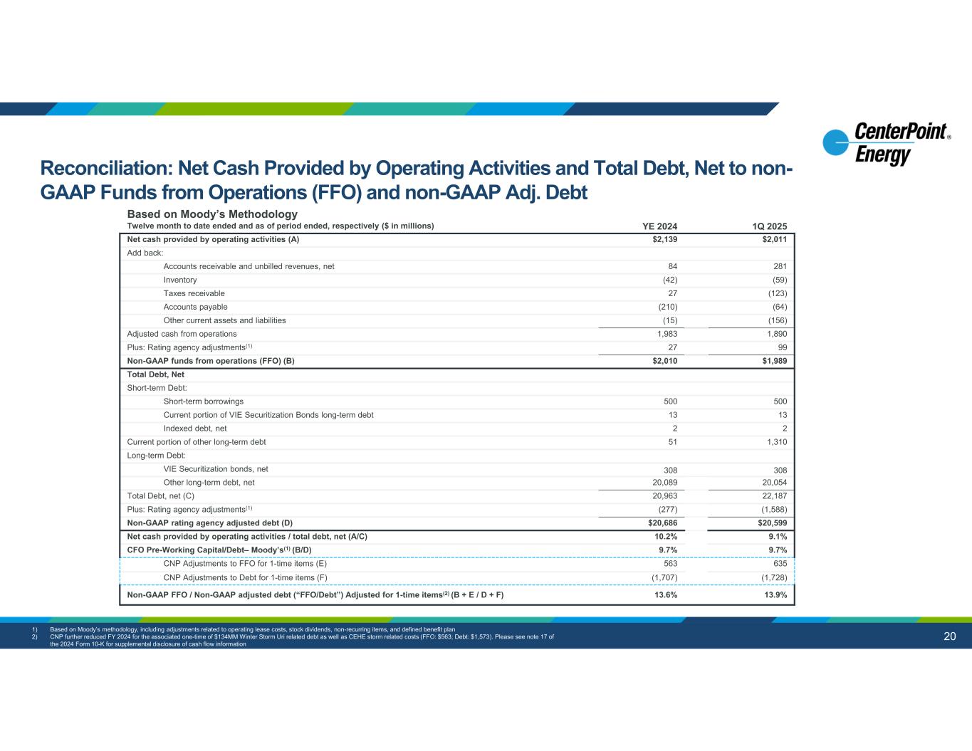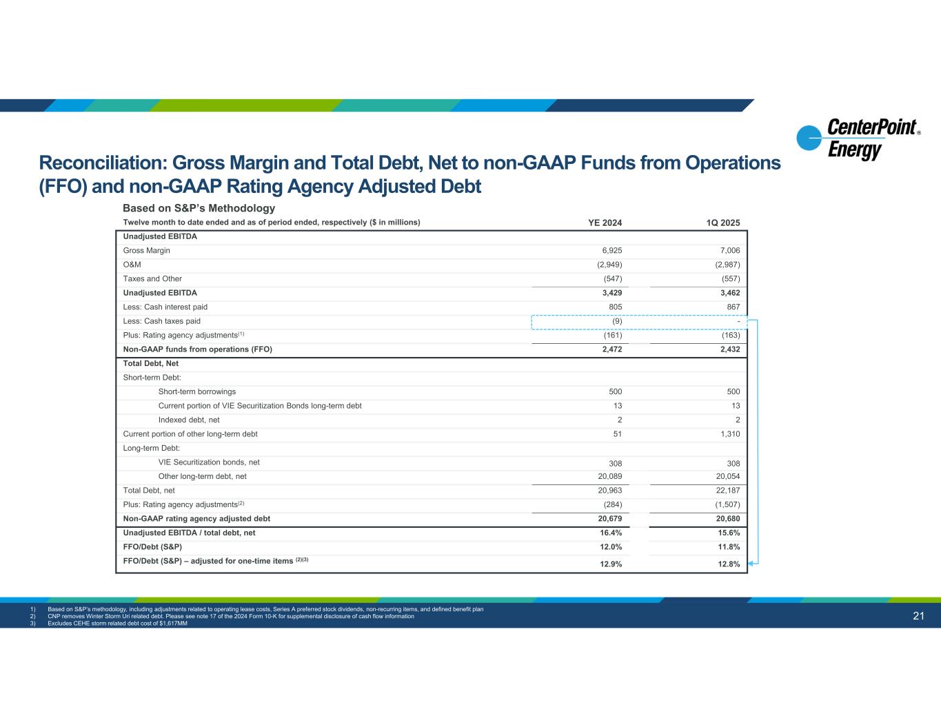 20 aaaaaaaaa 1Q 2025YE 2024Twelve month to date ended and as of period ended, respectively ($ in millions) $2,011$2,139Net cash provided by operating activities (A) Add back: 28184Accounts receivable and unbilled revenues, net (59)(42)Inventory (123)27Taxes receivable (64)(210)Accounts payable (156)(15)Other current assets and liabilities 1,8901,983Adjusted cash from operations 9927Plus: Rating agency adjustments(1) $1,989$2,010Non-GAAP funds from operations (FFO) (B) Total Debt, Net Short-term Debt: 500500Short-term borrowings 1313Current portion of VIE Securitization Bonds long-term debt 22Indexed debt, net 1,31051Current portion of other long-term debt Long-term Debt: 308308VIE Securitization bonds, net 20,05420,089Other long-term debt, net 22,18720,963Total Debt, net (C) (1,588)(277)Plus: Rating agency adjustments(1) $20,599$20,686Non-GAAP rating agency adjusted debt (D) 9.1%10.2%Net cash provided by operating activities / total debt, net (A/C) 9.7%9.7%CFO Pre-Working Capital/Debt– Moody’s(1) (B/D) 635563CNP Adjustments to FFO for 1-time items (E) (1,728)(1,707)CNP Adjustments to Debt for 1-time items (F) 13.9%13.6%Non-GAAP FFO / Non-GAAP adjusted debt (“FFO/Debt”) Adjusted for 1-time items(2) (B + E / D + F) Based on Moody’s Methodology 1) Based on Moody’s methodology, including adjustments related to operating lease costs, stock dividends, non-recurring items, and defined benefit plan 2) CNP further reduced FY 2024 for the associated one-time of $134MM Winter Storm Uri related debt as well as CEHE storm related costs (FFO: $563; Debt: $1,573). Please see note 17 of the 2024 Form 10-K for supplemental disclosure of cash flow information Reconciliation: Net Cash Provided by Operating Activities and Total Debt, Net to non- GAAP Funds from Operations (FFO) and non-GAAP Adj. Debt