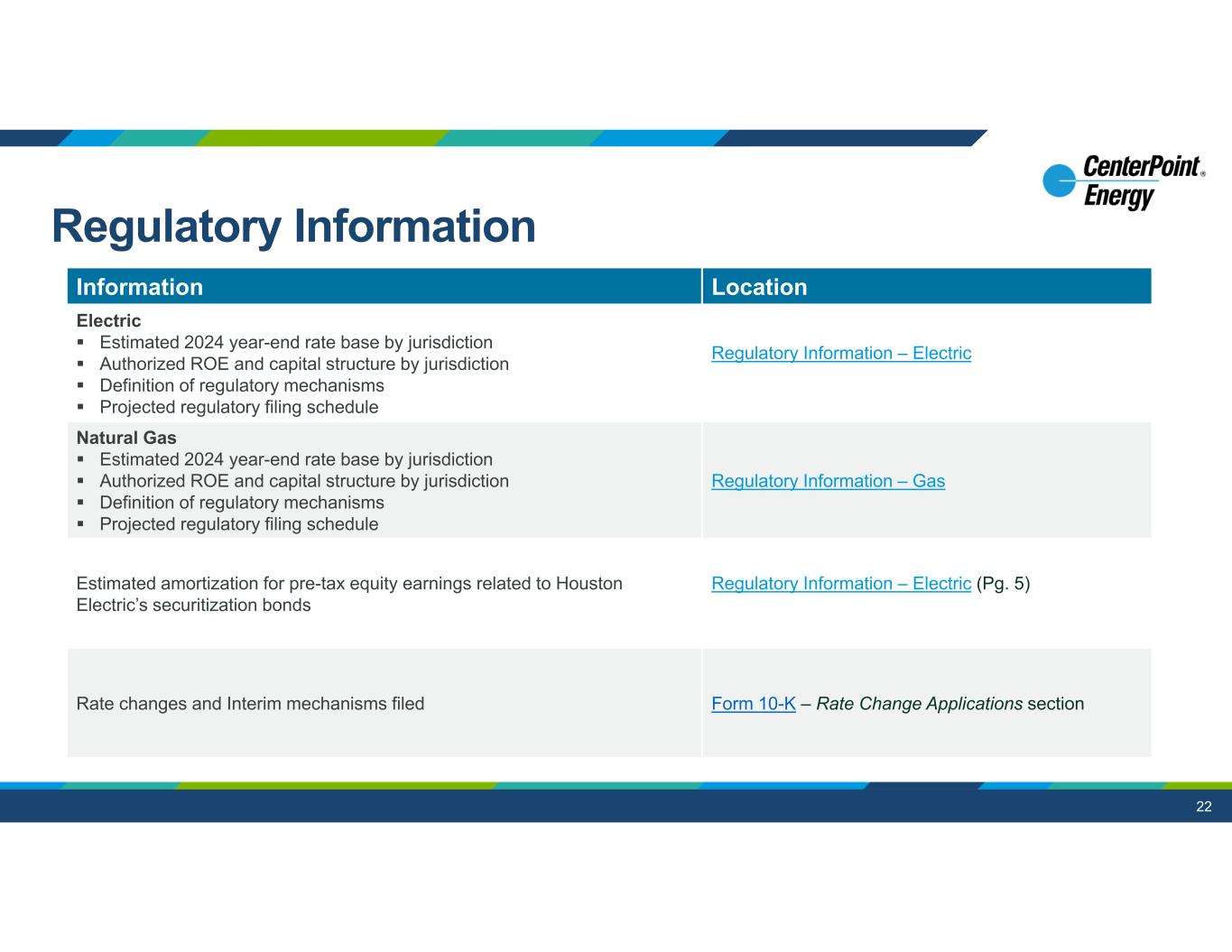 22 aaaaaaaaa LocationInformation Regulatory Information – Electric Electric  Estimated 2024 year-end rate base by jurisdiction  Authorized ROE and capital structure by jurisdiction  Definition of regulatory mechanisms  Projected regulatory filing schedule Regulatory Information – Gas Natural Gas  Estimated 2024 year-end rate base by jurisdiction  Authorized ROE and capital structure by jurisdiction  Definition of regulatory mechanisms  Projected regulatory filing schedule Regulatory Information – Electric (Pg. 5)Estimated amortization for pre-tax equity earnings related to Houston Electric’s securitization bonds Form 10-K – Rate Change Applications sectionRate changes and Interim mechanisms filed Regulatory Information