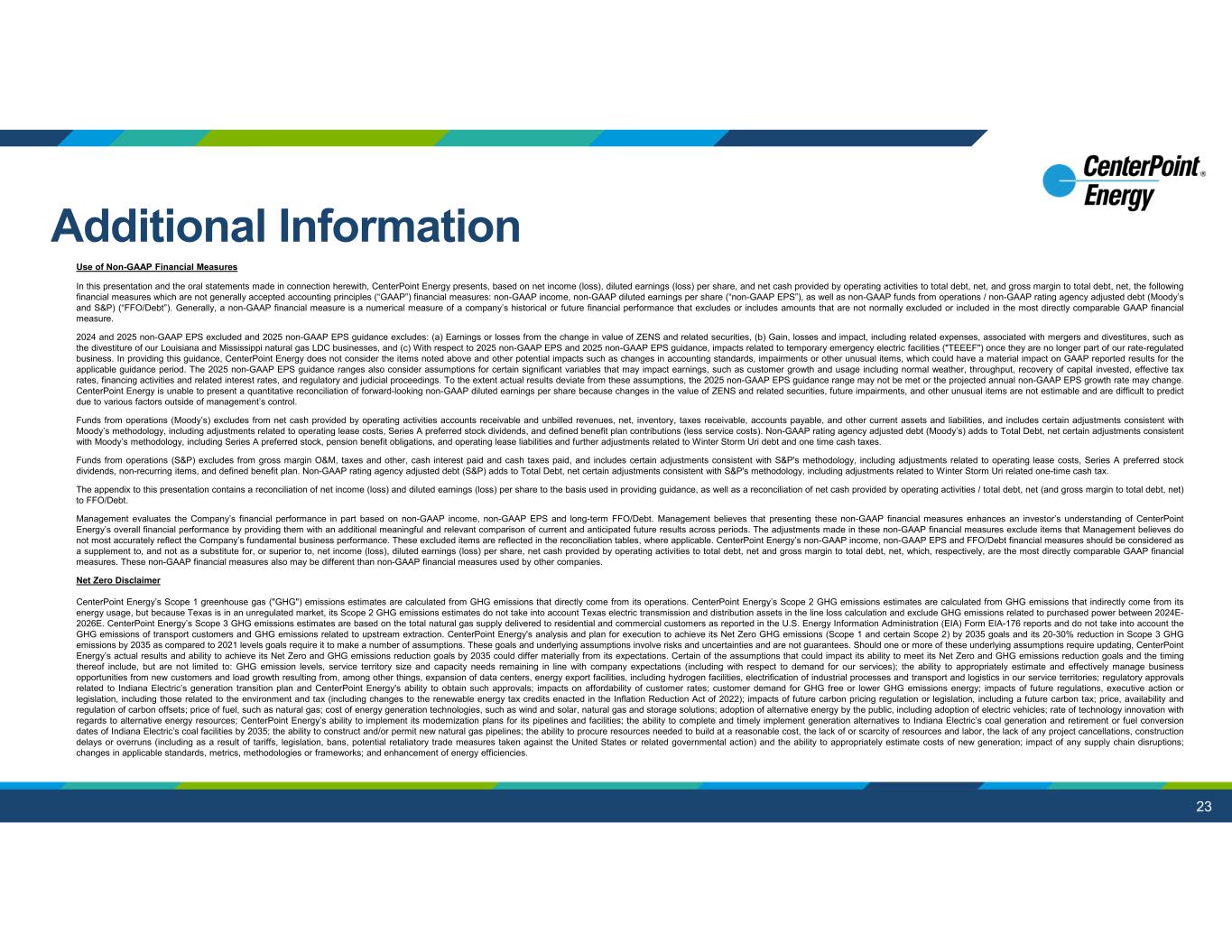 23 Additional Information Use of Non-GAAP Financial Measures In this presentation and the oral statements made in connection herewith, CenterPoint Energy presents, based on net income (loss), diluted earnings (loss) per share, and net cash provided by operating activities to total debt, net, and gross margin to total debt, net, the following financial measures which are not generally accepted accounting principles (“GAAP”) financial measures: non-GAAP income, non-GAAP diluted earnings per share (“non-GAAP EPS”), as well as non-GAAP funds from operations / non-GAAP rating agency adjusted debt (Moody’s and S&P) (“FFO/Debt”). Generally, a non-GAAP financial measure is a numerical measure of a company’s historical or future financial performance that excludes or includes amounts that are not normally excluded or included in the most directly comparable GAAP financial measure. 2024 and 2025 non-GAAP EPS excluded and 2025 non-GAAP EPS guidance excludes: (a) Earnings or losses from the change in value of ZENS and related securities, (b) Gain, losses and impact, including related expenses, associated with mergers and divestitures, such as the divestiture of our Louisiana and Mississippi natural gas LDC businesses, and (c) With respect to 2025 non-GAAP EPS and 2025 non-GAAP EPS guidance, impacts related to temporary emergency electric facilities ("TEEEF") once they are no longer part of our rate-regulated business. In providing this guidance, CenterPoint Energy does not consider the items noted above and other potential impacts such as changes in accounting standards, impairments or other unusual items, which could have a material impact on GAAP reported results for the applicable guidance period. The 2025 non-GAAP EPS guidance ranges also consider assumptions for certain significant variables that may impact earnings, such as customer growth and usage including normal weather, throughput, recovery of capital invested, effective tax rates, financing activities and related interest rates, and regulatory and judicial proceedings. To the extent actual results deviate from these assumptions, the 2025 non-GAAP EPS guidance range may not be met or the projected annual non-GAAP EPS growth rate may change. CenterPoint Energy is unable to present a quantitative reconciliation of forward-looking non-GAAP diluted earnings per share because changes in the value of ZENS and related securities, future impairments, and other unusual items are not estimable and are difficult to predict due to various factors outside of management’s control. Funds from operations (Moody’s) excludes from net cash provided by operating activities accounts receivable and unbilled revenues, net, inventory, taxes receivable, accounts payable, and other current assets and liabilities, and includes certain adjustments consistent with Moody’s methodology, including adjustments related to operating lease costs, Series A preferred stock dividends, and defined benefit plan contributions (less service costs). Non-GAAP rating agency adjusted debt (Moody’s) adds to Total Debt, net certain adjustments consistent with Moody’s methodology, including Series A preferred stock, pension benefit obligations, and operating lease liabilities and further adjustments related to Winter Storm Uri debt and one time cash taxes. Funds from operations (S&P) excludes from gross margin O&M, taxes and other, cash interest paid and cash taxes paid, and includes certain adjustments consistent with S&P's methodology, including adjustments related to operating lease costs, Series A preferred stock dividends, non-recurring items, and defined benefit plan. Non-GAAP rating agency adjusted debt (S&P) adds to Total Debt, net certain adjustments consistent with S&P's methodology, including adjustments related to Winter Storm Uri related one-time cash tax. The appendix to this presentation contains a reconciliation of net income (loss) and diluted earnings (loss) per share to the basis used in providing guidance, as well as a reconciliation of net cash provided by operating activities / total debt, net (and gross margin to total debt, net) to FFO/Debt. Management evaluates the Company’s financial performance in part based on non-GAAP income, non-GAAP EPS and long-term FFO/Debt. Management believes that presenting these non-GAAP financial measures enhances an investor’s understanding of CenterPoint Energy’s overall financial performance by providing them with an additional meaningful and relevant comparison of current and anticipated future results across periods. The adjustments made in these non-GAAP financial measures exclude items that Management believes do not most accurately reflect the Company’s fundamental business performance. These excluded items are reflected in the reconciliation tables, where applicable. CenterPoint Energy’s non-GAAP income, non-GAAP EPS and FFO/Debt financial measures should be considered as a supplement to, and not as a substitute for, or superior to, net income (loss), diluted earnings (loss) per share, net cash provided by operating activities to total debt, net and gross margin to total debt, net, which, respectively, are the most directly comparable GAAP financial measures. These non-GAAP financial measures also may be different than non-GAAP financial measures used by other companies. Net Zero Disclaimer CenterPoint Energy’s Scope 1 greenhouse gas ("GHG") emissions estimates are calculated from GHG emissions that directly come from its operations. CenterPoint Energy’s Scope 2 GHG emissions estimates are calculated from GHG emissions that indirectly come from its energy usage, but because Texas is in an unregulated market, its Scope 2 GHG emissions estimates do not take into account Texas electric transmission and distribution assets in the line loss calculation and exclude GHG emissions related to purchased power between 2024E- 2026E. CenterPoint Energy’s Scope 3 GHG emissions estimates are based 