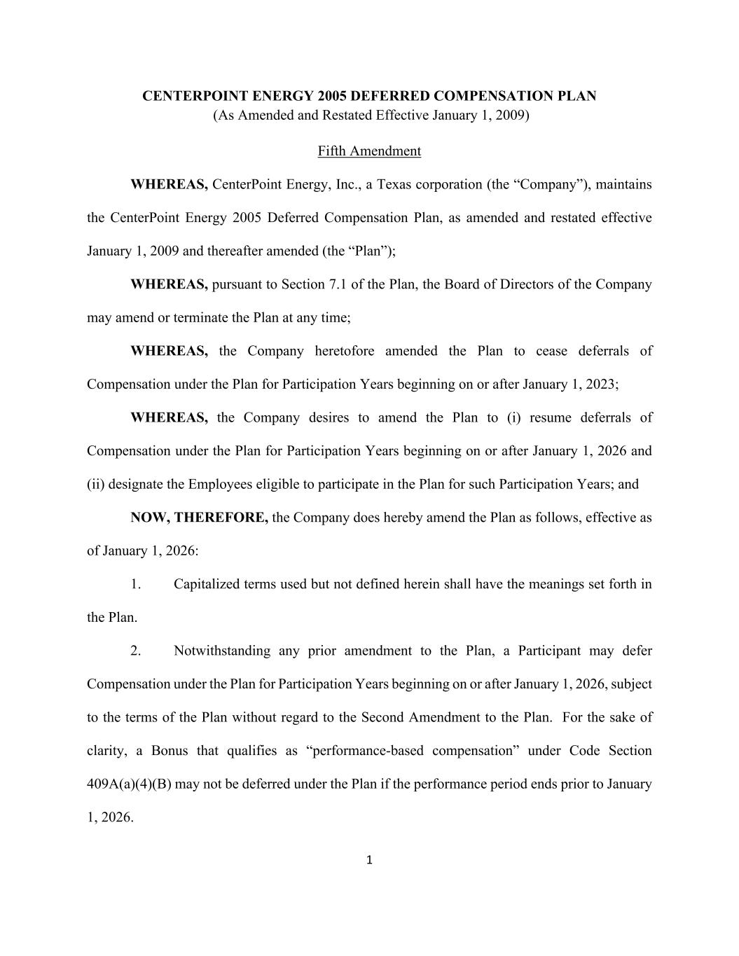 1 CENTERPOINT ENERGY 2005 DEFERRED COMPENSATION PLAN (As Amended and Restated Effective January 1, 2009) Fifth Amendment WHEREAS, CenterPoint Energy, Inc., a Texas corporation (the “Company”), maintains the CenterPoint Energy 2005 Deferred Compensation Plan, as amended and restated effective January 1, 2009 and thereafter amended (the “Plan”); WHEREAS, pursuant to Section 7.1 of the Plan, the Board of Directors of the Company may amend or terminate the Plan at any time; WHEREAS, the Company heretofore amended the Plan to cease deferrals of Compensation under the Plan for Participation Years beginning on or after January 1, 2023; WHEREAS, the Company desires to amend the Plan to (i) resume deferrals of Compensation under the Plan for Participation Years beginning on or after January 1, 2026 and (ii) designate the Employees eligible to participate in the Plan for such Participation Years; and NOW, THEREFORE, the Company does hereby amend the Plan as follows, effective as of January 1, 2026: 1. Capitalized terms used but not defined herein shall have the meanings set forth in the Plan. 2. Notwithstanding any prior amendment to the Plan, a Participant may defer Compensation under the Plan for Participation Years beginning on or after January 1, 2026, subject to the terms of the Plan without regard to the Second Amendment to the Plan. For the sake of clarity, a Bonus that qualifies as “performance-based compensation” under Code Section 409A(a)(4)(B) may not be deferred under the Plan if the performance period ends prior to January 1, 2026.