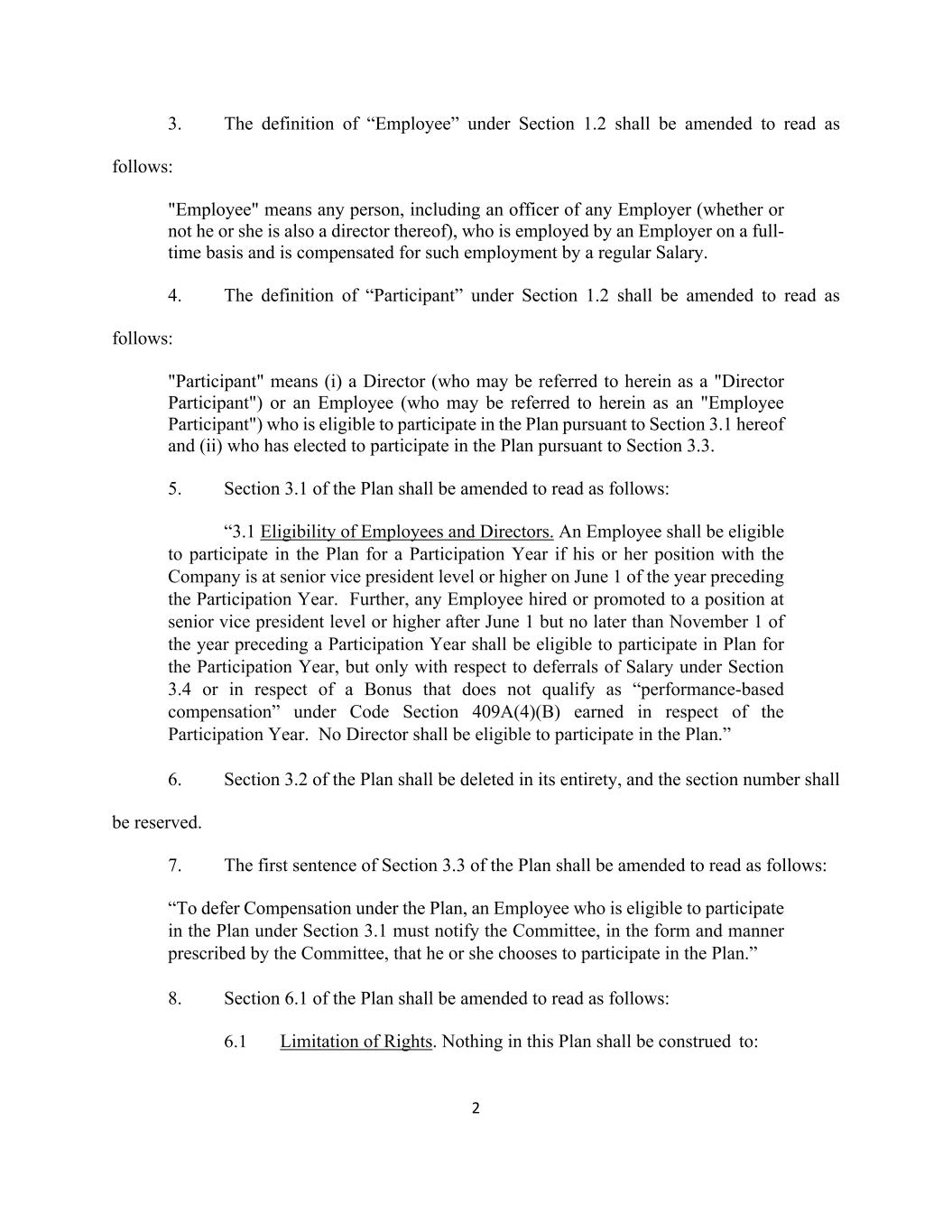 2 3. The definition of “Employee” under Section 1.2 shall be amended to read as follows: "Employee" means any person, including an officer of any Employer (whether or not he or she is also a director thereof), who is employed by an Employer on a full- time basis and is compensated for such employment by a regular Salary. 4. The definition of “Participant” under Section 1.2 shall be amended to read as follows: "Participant" means (i) a Director (who may be referred to herein as a "Director Participant") or an Employee (who may be referred to herein as an "Employee Participant") who is eligible to participate in the Plan pursuant to Section 3.1 hereof and (ii) who has elected to participate in the Plan pursuant to Section 3.3. 5. Section 3.1 of the Plan shall be amended to read as follows: “3.1 Eligibility of Employees and Directors. An Employee shall be eligible to participate in the Plan for a Participation Year if his or her position with the Company is at senior vice president level or higher on June 1 of the year preceding the Participation Year. Further, any Employee hired or promoted to a position at senior vice president level or higher after June 1 but no later than November 1 of the year preceding a Participation Year shall be eligible to participate in Plan for the Participation Year, but only with respect to deferrals of Salary under Section 3.4 or in respect of a Bonus that does not qualify as “performance-based compensation” under Code Section 409A(4)(B) earned in respect of the Participation Year. No Director shall be eligible to participate in the Plan.” 6. Section 3.2 of the Plan shall be deleted in its entirety, and the section number shall be reserved. 7. The first sentence of Section 3.3 of the Plan shall be amended to read as follows: “To defer Compensation under the Plan, an Employee who is eligible to participate in the Plan under Section 3.1 must notify the Committee, in the form and manner prescribed by the Committee, that he or she chooses to participate in the Plan.” 8. Section 6.1 of the Plan shall be amended to read as follows: 6.1 Limitation of Rights. Nothing in this Plan shall be construed to: