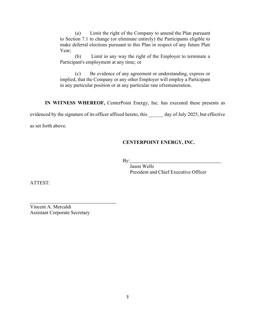 3 (a) Limit the right of the Company to amend the Plan pursuant to Section 7.1 to change (or eliminate entirely) the Participants eligible to make deferral elections pursuant to this Plan in respect of any future Plan Year; (b) Limit in any way the right of the Employer to terminate a Participant's employment at any time; or (c) Be evidence of any agreement or understanding, express or implied, that the Company or any other Employer will employ a Participant in any particular position or at any particular rate of remuneration. IN WITNESS WHEREOF, CenterPoint Energy, Inc. has executed these presents as evidenced by the signature of its officer affixed hereto, this ______ day of July 2025, but effective as set forth above. CENTERPOINT ENERGY, INC. By: Jason Wells President and Chief Executive Officer ATTEST: Vincent A. Mercaldi Assistant Corporate Secretary