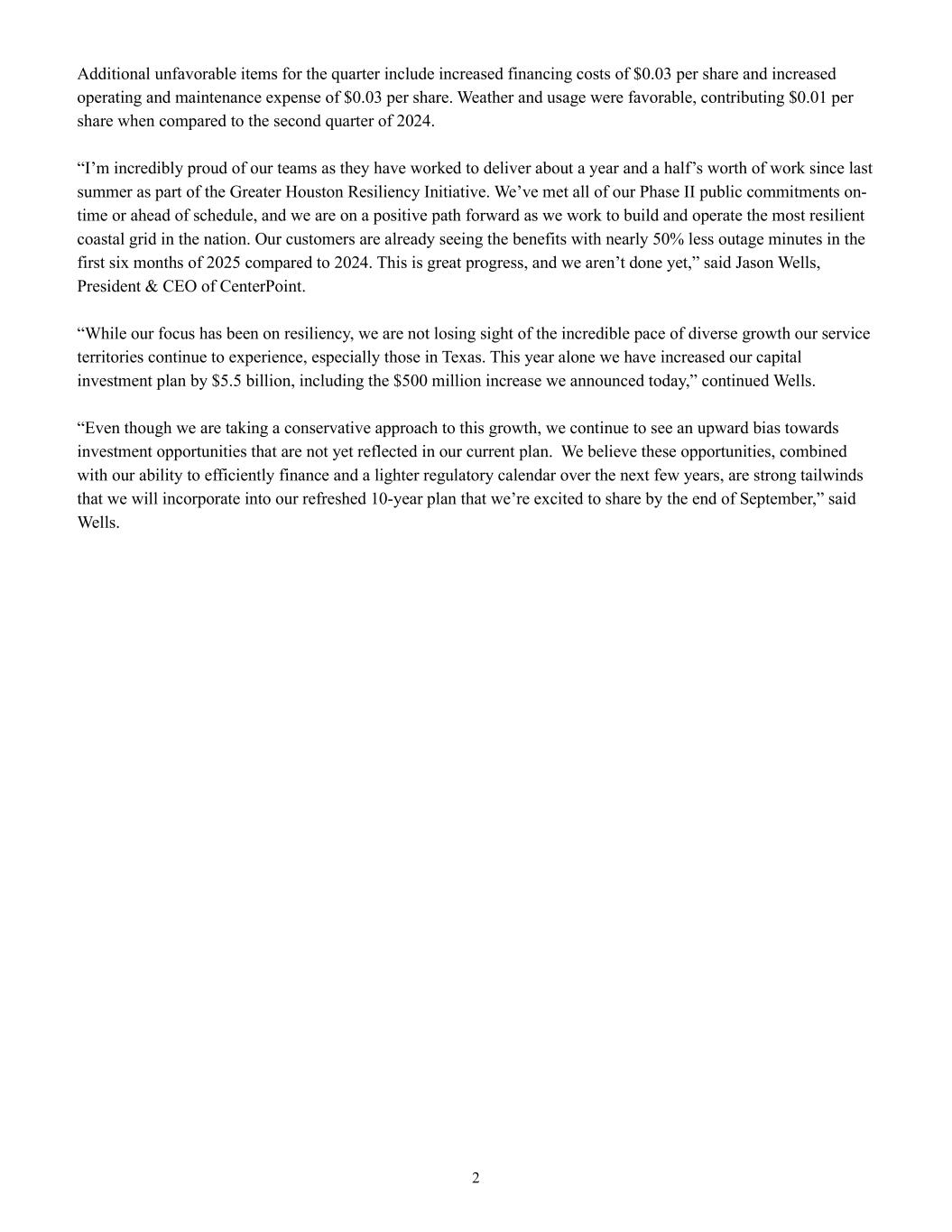2 Additional unfavorable items for the quarter include increased financing costs of $0.03 per share and increased operating and maintenance expense of $0.03 per share. Weather and usage were favorable, contributing $0.01 per share when compared to the second quarter of 2024. “I’m incredibly proud of our teams as they have worked to deliver about a year and a half’s worth of work since last summer as part of the Greater Houston Resiliency Initiative. We’ve met all of our Phase II public commitments on- time or ahead of schedule, and we are on a positive path forward as we work to build and operate the most resilient coastal grid in the nation. Our customers are already seeing the benefits with nearly 50% less outage minutes in the first six months of 2025 compared to 2024. This is great progress, and we aren’t done yet,” said Jason Wells, President & CEO of CenterPoint. “While our focus has been on resiliency, we are not losing sight of the incredible pace of diverse growth our service territories continue to experience, especially those in Texas. This year alone we have increased our capital investment plan by $5.5 billion, including the $500 million increase we announced today,” continued Wells. “Even though we are taking a conservative approach to this growth, we continue to see an upward bias towards investment opportunities that are not yet reflected in our current plan. We believe these opportunities, combined with our ability to efficiently finance and a lighter regulatory calendar over the next few years, are strong tailwinds that we will incorporate into our refreshed 10-year plan that we’re excited to share by the end of September,” said Wells.