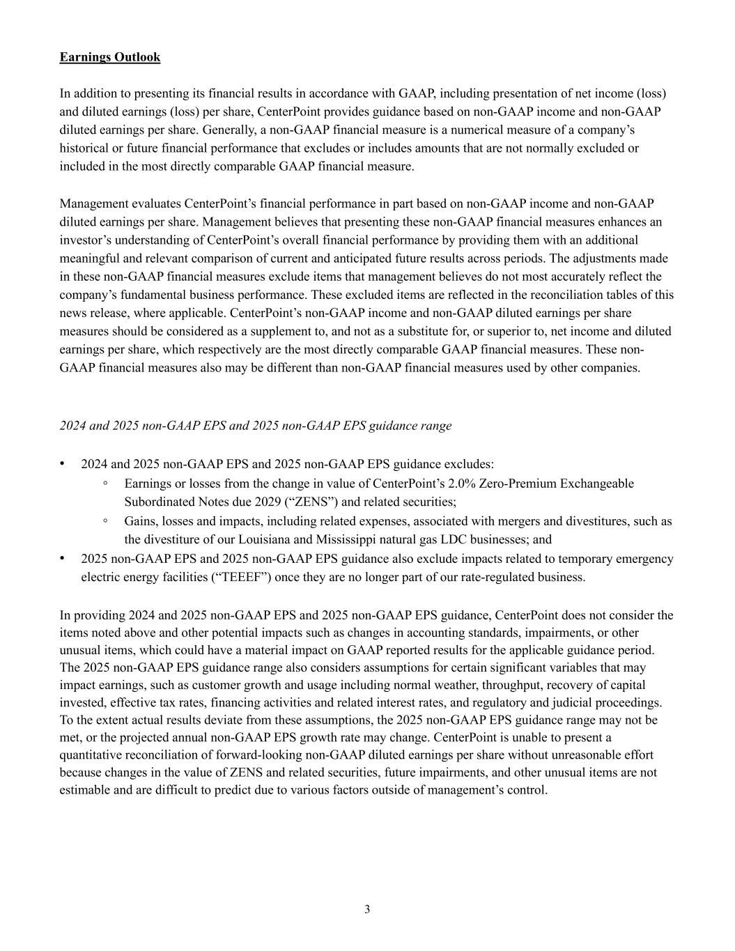 3 Earnings Outlook In addition to presenting its financial results in accordance with GAAP, including presentation of net income (loss) and diluted earnings (loss) per share, CenterPoint provides guidance based on non-GAAP income and non-GAAP diluted earnings per share. Generally, a non-GAAP financial measure is a numerical measure of a company’s historical or future financial performance that excludes or includes amounts that are not normally excluded or included in the most directly comparable GAAP financial measure. Management evaluates CenterPoint’s financial performance in part based on non-GAAP income and non-GAAP diluted earnings per share. Management believes that presenting these non-GAAP financial measures enhances an investor’s understanding of CenterPoint’s overall financial performance by providing them with an additional meaningful and relevant comparison of current and anticipated future results across periods. The adjustments made in these non-GAAP financial measures exclude items that management believes do not most accurately reflect the company’s fundamental business performance. These excluded items are reflected in the reconciliation tables of this news release, where applicable. CenterPoint’s non-GAAP income and non-GAAP diluted earnings per share measures should be considered as a supplement to, and not as a substitute for, or superior to, net income and diluted earnings per share, which respectively are the most directly comparable GAAP financial measures. These non- GAAP financial measures also may be different than non-GAAP financial measures used by other companies. 2024 and 2025 non-GAAP EPS and 2025 non-GAAP EPS guidance range • 2024 and 2025 non-GAAP EPS and 2025 non-GAAP EPS guidance excludes: ◦ Earnings or losses from the change in value of CenterPoint’s 2.0% Zero-Premium Exchangeable Subordinated Notes due 2029 (“ZENS”) and related securities; ◦ Gains, losses and impacts, including related expenses, associated with mergers and divestitures, such as the divestiture of our Louisiana and Mississippi natural gas LDC businesses; and • 2025 non-GAAP EPS and 2025 non-GAAP EPS guidance also exclude impacts related to temporary emergency electric energy facilities (“TEEEF”) once they are no longer part of our rate-regulated business. In providing 2024 and 2025 non-GAAP EPS and 2025 non-GAAP EPS guidance, CenterPoint does not consider the items noted above and other potential impacts such as changes in accounting standards, impairments, or other unusual items, which could have a material impact on GAAP reported results for the applicable guidance period. The 2025 non-GAAP EPS guidance range also considers assumptions for certain significant variables that may impact earnings, such as customer growth and usage including normal weather, throughput, recovery of capital invested, effective tax rates, financing activities and related interest rates, and regulatory and judicial proceedings. To the extent actual results deviate from these assumptions, the 2025 non-GAAP EPS guidance range may not be met, or the projected annual non-GAAP EPS growth rate may change. CenterPoint is unable to present a quantitative reconciliation of forward-looking non-GAAP diluted earnings per share without unreasonable effort because changes in the value of ZENS and related securities, future impairments, and other unusual items are not estimable and are difficult to predict due to various factors outside of management’s control.