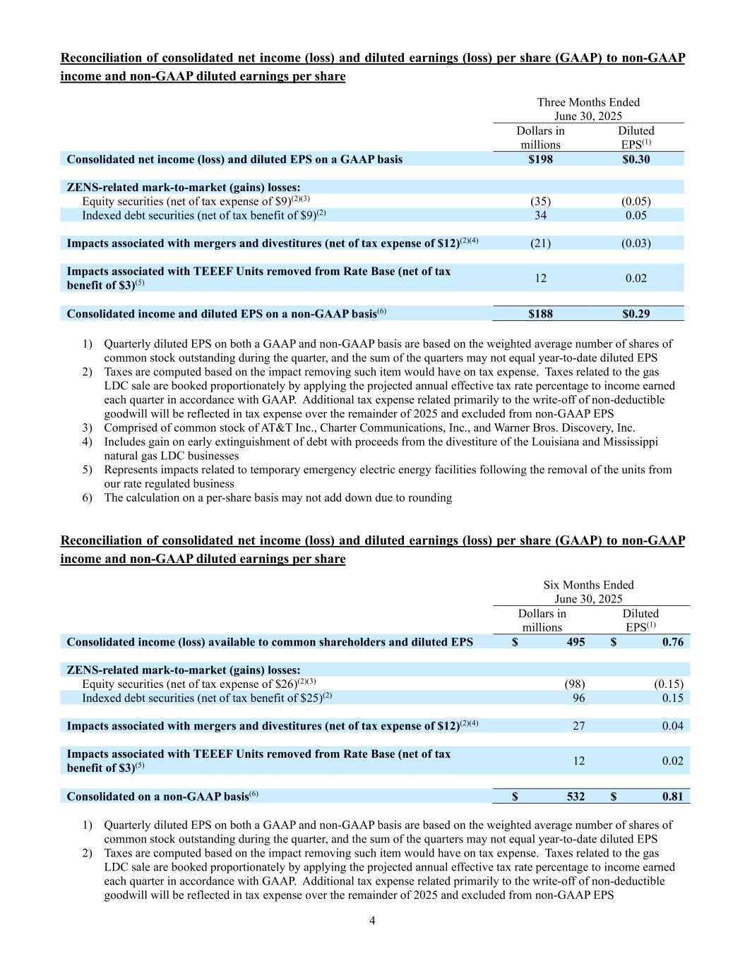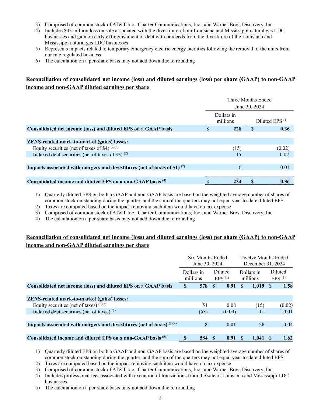 5 3) Comprised of common stock of AT&T Inc., Charter Communications, Inc., and Warner Bros. Discovery, Inc. 4) Includes $43 million loss on sale associated with the divestiture of our Louisiana and Mississippi natural gas LDC businesses and gain on early extinguishment of debt with proceeds from the divestiture of the Louisiana and Mississippi natural gas LDC businesses 5) Represents impacts related to temporary emergency electric energy facilities following the removal of the units from our rate regulated business 6) The calculation on a per-share basis may not add down due to rounding Reconciliation of consolidated net income (loss) and diluted earnings (loss) per share (GAAP) to non-GAAP income and non-GAAP diluted earnings per share Three Months Ended June 30, 2024 Dollars in millions Diluted EPS (1) Consolidated net income (loss) and diluted EPS on a GAAP basis $ 228 $ 0.36 ZENS-related mark-to-market (gains) losses: Equity securities (net of taxes of $4) (2)(3) (15) (0.02) Indexed debt securities (net of taxes of $3) (2) 15 0.02 Impacts associated with mergers and divestitures (net of taxes of $1) (2) 6 0.01 Consolidated income and diluted EPS on a non-GAAP basis (4) $ 234 $ 0.36 1) Quarterly diluted EPS on both a GAAP and non-GAAP basis are based on the weighted average number of shares of common stock outstanding during the quarter, and the sum of the quarters may not equal year-to-date diluted EPS 2) Taxes are computed based on the impact removing such item would have on tax expense 3) Comprised of common stock of AT&T Inc., Charter Communications, Inc., and Warner Bros. Discovery, Inc. 4) The calculation on a per-share basis may not add down due to rounding Reconciliation of consolidated net income (loss) and diluted earnings (loss) per share (GAAP) to non-GAAP income and non-GAAP diluted earnings per share Six Months Ended June 30, 2024 Twelve Months Ended December 31, 2024 Dollars in millions Diluted EPS (1) Dollars in millions Diluted EPS (1) Consolidated net income (loss) and diluted EPS on a GAAP basis $ 578 $ 0.91 $ 1,019 $ 1.58 ZENS-related mark-to-market (gains) losses: Equity securities (net of taxes) (2)(3) 51 0.08 (15) (0.02) Indexed debt securities (net of taxes) (2) (53) (0.09) 11 0.01 Impacts associated with mergers and divestitures (net of taxes) (2)(4) 8 0.01 26 0.04 Consolidated income and diluted EPS on a non-GAAP basis (5) $ 584 $ 0.91 $ 1,041 $ 1.62 1) Quarterly diluted EPS on both a GAAP and non-GAAP basis are based on the weighted average number of shares of common stock outstanding during the quarter, and the sum of the quarters may not equal year-to-date diluted EPS 2) Taxes are computed based on the impact removing such item would have on tax expense 3) Comprised of common stock of AT&T Inc., Charter Communications, Inc., and Warner Bros. Discovery, Inc. 4) Includes professional fees associated with execution of transactions from the sale of Louisiana and Mississippi LDC businesses 5) The calculation on a per-share basis may not add down due to rounding