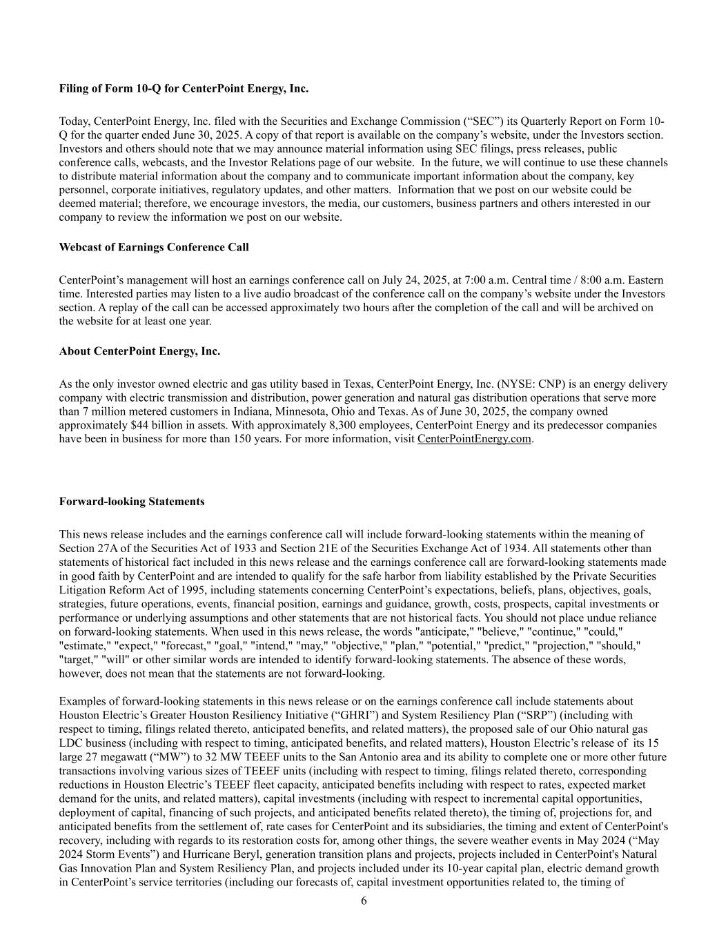 6 Filing of Form 10-Q for CenterPoint Energy, Inc. Today, CenterPoint Energy, Inc. filed with the Securities and Exchange Commission (“SEC”) its Quarterly Report on Form 10- Q for the quarter ended June 30, 2025. A copy of that report is available on the company’s website, under the Investors section. Investors and others should note that we may announce material information using SEC filings, press releases, public conference calls, webcasts, and the Investor Relations page of our website. In the future, we will continue to use these channels to distribute material information about the company and to communicate important information about the company, key personnel, corporate initiatives, regulatory updates, and other matters. Information that we post on our website could be deemed material; therefore, we encourage investors, the media, our customers, business partners and others interested in our company to review the information we post on our website. Webcast of Earnings Conference Call CenterPoint’s management will host an earnings conference call on July 24, 2025, at 7:00 a.m. Central time / 8:00 a.m. Eastern time. Interested parties may listen to a live audio broadcast of the conference call on the company’s website under the Investors section. A replay of the call can be accessed approximately two hours after the completion of the call and will be archived on the website for at least one year. About CenterPoint Energy, Inc. As the only investor owned electric and gas utility based in Texas, CenterPoint Energy, Inc. (NYSE: CNP) is an energy delivery company with electric transmission and distribution, power generation and natural gas distribution operations that serve more than 7 million metered customers in Indiana, Minnesota, Ohio and Texas. As of June 30, 2025, the company owned approximately $44 billion in assets. With approximately 8,300 employees, CenterPoint Energy and its predecessor companies have been in business for more than 150 years. For more information, visit CenterPointEnergy.com. Forward-looking Statements This news release includes and the earnings conference call will include forward-looking statements within the meaning of Section 27A of the Securities Act of 1933 and Section 21E of the Securities Exchange Act of 1934. All statements other than statements of historical fact included in this news release and the earnings conference call are forward-looking statements made in good faith by CenterPoint and are intended to qualify for the safe harbor from liability established by the Private Securities Litigation Reform Act of 1995, including statements concerning CenterPoint’s expectations, beliefs, plans, objectives, goals, strategies, future operations, events, financial position, earnings and guidance, growth, costs, prospects, capital investments or performance or underlying assumptions and other statements that are not historical facts. You should not place undue reliance on forward-looking statements. When used in this news release, the words "anticipate," "believe," "continue," "could," "estimate," "expect," "forecast," "goal," "intend," "may," "objective," "plan," "potential," "predict," "projection," "should," "target," "will" or other similar words are intended to identify forward-looking statements. The absence of these words, however, does not mean that the statements are not forward-looking. Examples of forward-looking statements in this news release or on the earnings conference call include statements about Houston Electric’s Greater Houston Resiliency Initiative (“GHRI”) and System Resiliency Plan (“SRP”) (including with respect to timing, filings related thereto, anticipated benefits, and related matters), the proposed sale of our Ohio natural gas LDC business (including with respect to timing, anticipated benefits, and related matters), Houston Electric’s release of its 15 large 27 megawatt (“MW”) to 32 MW TEEEF units to the San Antonio area and its ability to complete one or more other future transactions involving various sizes of TEEEF units (including with respect to timing, filings related thereto, corresponding reductions in Houston Electric’s TEEEF fleet capacity, anticipated benefits including with respect to rates, expected market demand for the units, and related matters), capital investments (including with respect to incremental capital opportunities, deployment of capital, financing of such projects, and anticipated benefits related thereto), the timing of, projections for, and anticipated benefits from the settlement of, rate cases for CenterPoint and its subsidiaries, the timing and extent of CenterPoint's recovery, including with regards to its restoration costs for, among other things, the severe weather events in May 2024 (“May 2024 Storm Events”) and Hurricane Beryl, generation transition plans and projects, projects included in CenterPoint's Natural Gas Innovation Plan and System Resiliency Plan, and projects included under its 10-year capital plan, electric demand growth in CenterPoint’s service territories (including our forecasts of, capital investment opportunities related to, the timing of