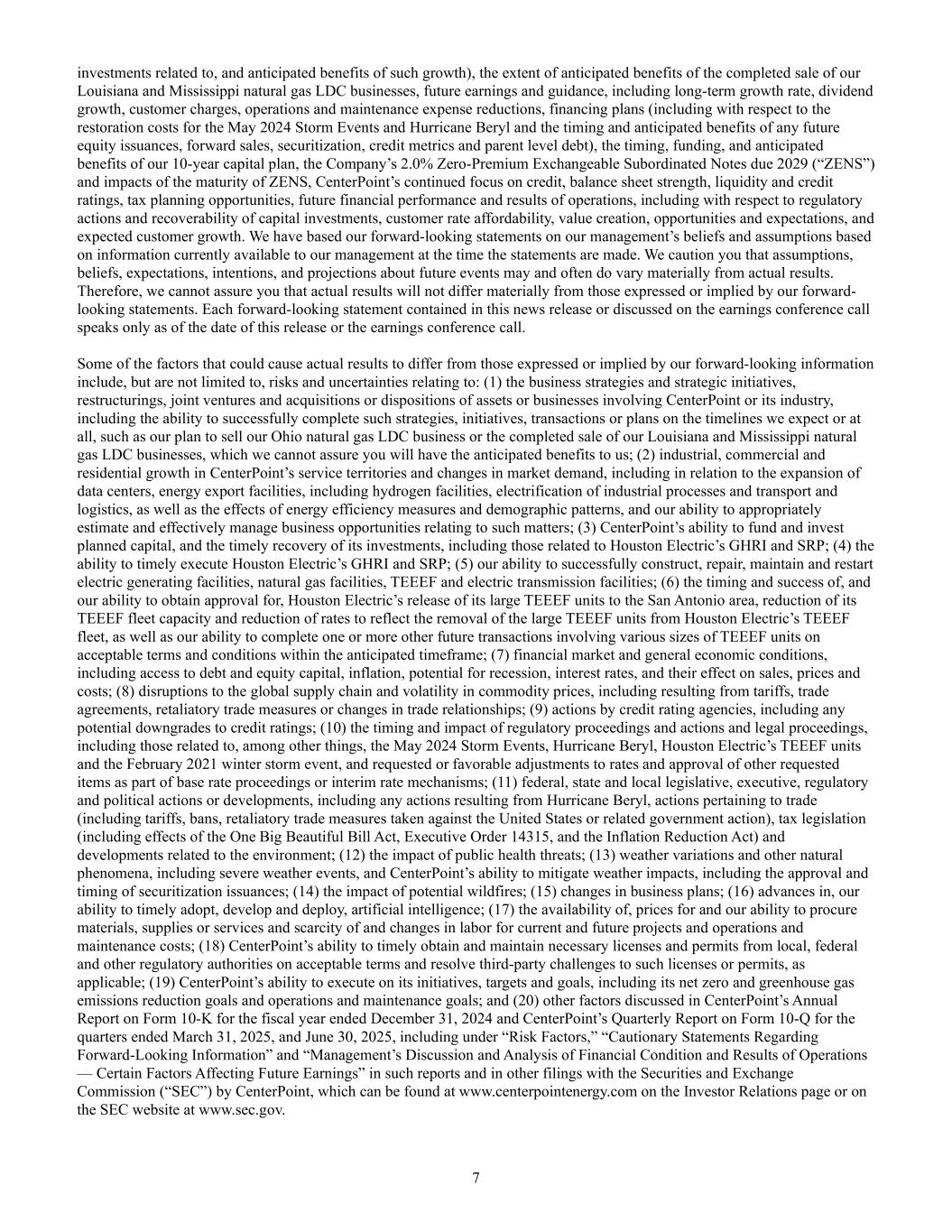7 investments related to, and anticipated benefits of such growth), the extent of anticipated benefits of the completed sale of our Louisiana and Mississippi natural gas LDC businesses, future earnings and guidance, including long-term growth rate, dividend growth, customer charges, operations and maintenance expense reductions, financing plans (including with respect to the restoration costs for the May 2024 Storm Events and Hurricane Beryl and the timing and anticipated benefits of any future equity issuances, forward sales, securitization, credit metrics and parent level debt), the timing, funding, and anticipated benefits of our 10-year capital plan, the Company’s 2.0% Zero-Premium Exchangeable Subordinated Notes due 2029 (“ZENS”) and impacts of the maturity of ZENS, CenterPoint’s continued focus on credit, balance sheet strength, liquidity and credit ratings, tax planning opportunities, future financial performance and results of operations, including with respect to regulatory actions and recoverability of capital investments, customer rate affordability, value creation, opportunities and expectations, and expected customer growth. We have based our forward-looking statements on our management’s beliefs and assumptions based on information currently available to our management at the time the statements are made. We caution you that assumptions, beliefs, expectations, intentions, and projections about future events may and often do vary materially from actual results. Therefore, we cannot assure you that actual results will not differ materially from those expressed or implied by our forward- looking statements. Each forward-looking statement contained in this news release or discussed on the earnings conference call speaks only as of the date of this release or the earnings conference call. Some of the factors that could cause actual results to differ from those expressed or implied by our forward-looking information include, but are not limited to, risks and uncertainties relating to: (1) the business strategies and strategic initiatives, restructurings, joint ventures and acquisitions or dispositions of assets or businesses involving CenterPoint or its industry, including the ability to successfully complete such strategies, initiatives, transactions or plans on the timelines we expect or at all, such as our plan to sell our Ohio natural gas LDC business or the completed sale of our Louisiana and Mississippi natural gas LDC businesses, which we cannot assure you will have the anticipated benefits to us; (2) industrial, commercial and residential growth in CenterPoint’s service territories and changes in market demand, including in relation to the expansion of data centers, energy export facilities, including hydrogen facilities, electrification of industrial processes and transport and logistics, as well as the effects of energy efficiency measures and demographic patterns, and our ability to appropriately estimate and effectively manage business opportunities relating to such matters; (3) CenterPoint’s ability to fund and invest planned capital, and the timely recovery of its investments, including those related to Houston Electric’s GHRI and SRP; (4) the ability to timely execute Houston Electric’s GHRI and SRP; (5) our ability to successfully construct, repair, maintain and restart electric generating facilities, natural gas facilities, TEEEF and electric transmission facilities; (6) the timing and success of, and our ability to obtain approval for, Houston Electric’s release of its large TEEEF units to the San Antonio area, reduction of its TEEEF fleet capacity and reduction of rates to reflect the removal of the large TEEEF units from Houston Electric’s TEEEF fleet, as well as our ability to complete one or more other future transactions involving various sizes of TEEEF units on acceptable terms and conditions within the anticipated timeframe; (7) financial market and general economic conditions, including access to debt and equity capital, inflation, potential for recession, interest rates, and their effect on sales, prices and costs; (8) disruptions to the global supply chain and volatility in commodity prices, including resulting from tariffs, trade agreements, retaliatory trade measures or changes in trade relationships; (9) actions by credit rating agencies, including any potential downgrades to credit ratings; (10) the timing and impact of regulatory proceedings and actions and legal proceedings, including those related to, among other things, the May 2024 Storm Events, Hurricane Beryl, Houston Electric’s TEEEF units and the February 2021 winter storm event, and requested or favorable adjustments to rates and approval of other requested items as part of base rate proceedings or interim rate mechanisms; (11) federal, state and local legislative, executive, regulatory and political actions or developments, including any actions resulting from Hurricane Beryl, actions pertaining to trade (including tariffs, bans, retaliatory trade measures taken against the United States or related government action), tax legislation (including effects of the One Big Beautiful Bill Act, Executive Order 14315, and the Inflation Reduction Act) and developments related to the environment; (12) the impact of public health threats; (13) weather variations and other natural phenomena, including severe weather events, and CenterPoint’s ability to mitigate weather impacts, including the approval and timing of securitization issuances; (14) the impact of potential wildfires; (15) changes in business plans; (16) advances in, our ability to timely adopt, develop and deploy, artificial intelligence; (17) the availability of, prices for and our ability to procure materials, supplies or services and scarcity of and changes in labor for current and future projects and operations and maintenance costs; (18) CenterPoint’s ability to timely obtain and maintain necessary license