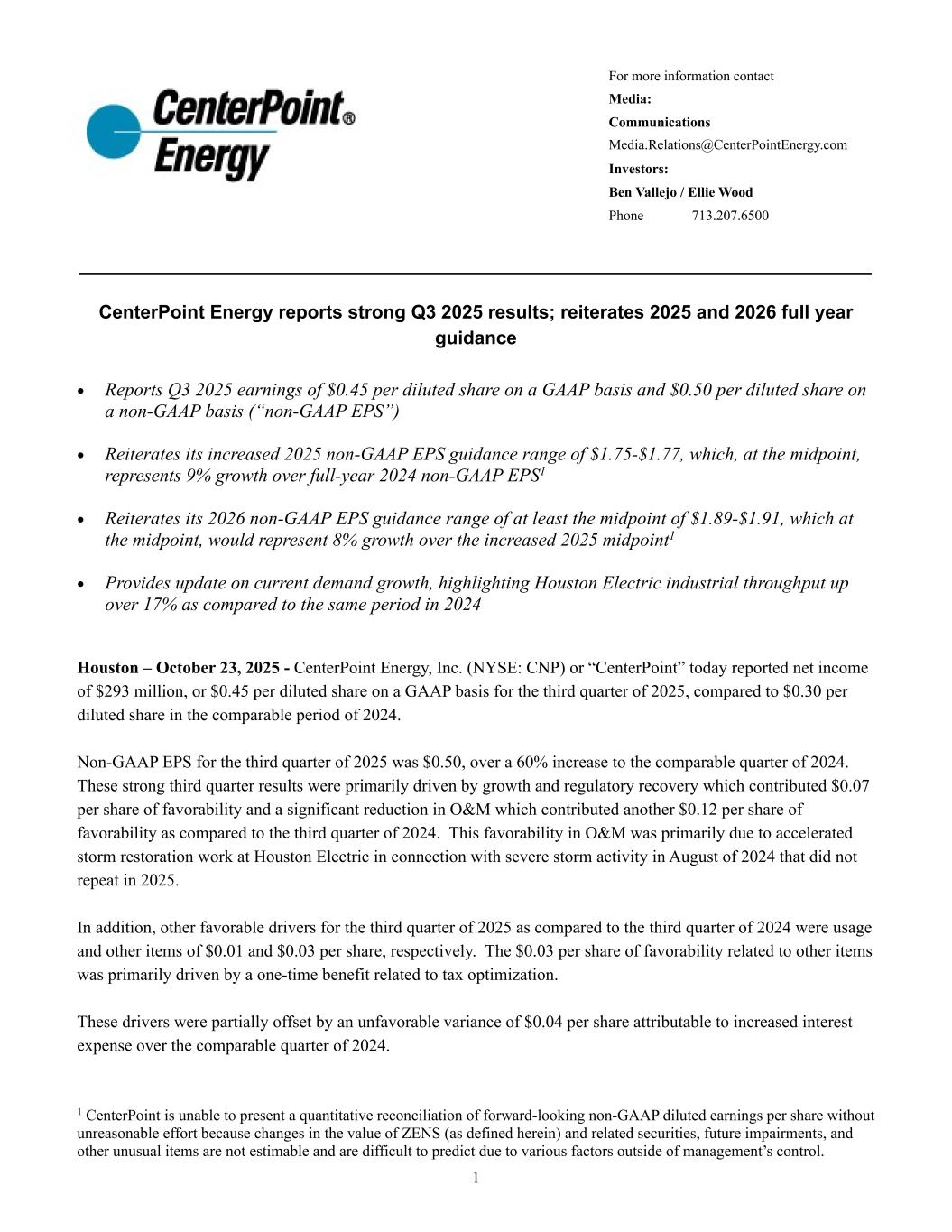 1 CenterPoint Energy reports strong Q3 2025 results; reiterates 2025 and 2026 full year guidance • Reports Q3 2025 earnings of $0.45 per diluted share on a GAAP basis and $0.50 per diluted share on a non-GAAP basis (“non-GAAP EPS”) • Reiterates its increased 2025 non-GAAP EPS guidance range of $1.75-$1.77, which, at the midpoint, represents 9% growth over full-year 2024 non-GAAP EPS1 • Reiterates its 2026 non-GAAP EPS guidance range of at least the midpoint of $1.89-$1.91, which at the midpoint, would represent 8% growth over the increased 2025 midpoint1 • Provides update on current demand growth, highlighting Houston Electric industrial throughput up over 17% as compared to the same period in 2024 Houston – October 23, 2025 - CenterPoint Energy, Inc. (NYSE: CNP) or “CenterPoint” today reported net income of $293 million, or $0.45 per diluted share on a GAAP basis for the third quarter of 2025, compared to $0.30 per diluted share in the comparable period of 2024. Non-GAAP EPS for the third quarter of 2025 was $0.50, over a 60% increase to the comparable quarter of 2024. These strong third quarter results were primarily driven by growth and regulatory recovery which contributed $0.07 per share of favorability and a significant reduction in O&M which contributed another $0.12 per share of favorability as compared to the third quarter of 2024. This favorability in O&M was primarily due to accelerated storm restoration work at Houston Electric in connection with severe storm activity in August of 2024 that did not repeat in 2025. In addition, other favorable drivers for the third quarter of 2025 as compared to the third quarter of 2024 were usage and other items of $0.01 and $0.03 per share, respectively. The $0.03 per share of favorability related to other items was primarily driven by a one-time benefit related to tax optimization. These drivers were partially offset by an unfavorable variance of $0.04 per share attributable to increased interest expense over the comparable quarter of 2024. 1 CenterPoint is unable to present a quantitative reconciliation of forward-looking non-GAAP diluted earnings per share without unreasonable effort because changes in the value of ZENS (as defined herein) and related securities, future impairments, and other unusual items are not estimable and are difficult to predict due to various factors outside of management’s control. For more information contact Media: Communications Media.Relations@CenterPointEnergy.com Investors: Ben Vallejo / Ellie Wood Phone 713.207.6500