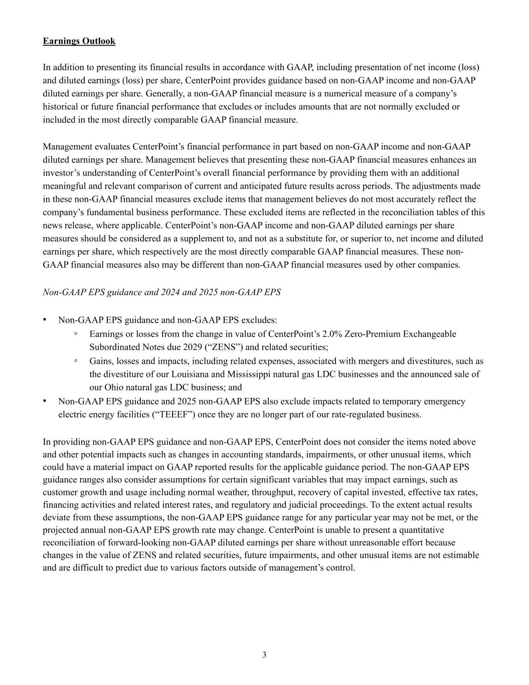 3 Earnings Outlook In addition to presenting its financial results in accordance with GAAP, including presentation of net income (loss) and diluted earnings (loss) per share, CenterPoint provides guidance based on non-GAAP income and non-GAAP diluted earnings per share. Generally, a non-GAAP financial measure is a numerical measure of a company’s historical or future financial performance that excludes or includes amounts that are not normally excluded or included in the most directly comparable GAAP financial measure. Management evaluates CenterPoint’s financial performance in part based on non-GAAP income and non-GAAP diluted earnings per share. Management believes that presenting these non-GAAP financial measures enhances an investor’s understanding of CenterPoint’s overall financial performance by providing them with an additional meaningful and relevant comparison of current and anticipated future results across periods. The adjustments made in these non-GAAP financial measures exclude items that management believes do not most accurately reflect the company’s fundamental business performance. These excluded items are reflected in the reconciliation tables of this news release, where applicable. CenterPoint’s non-GAAP income and non-GAAP diluted earnings per share measures should be considered as a supplement to, and not as a substitute for, or superior to, net income and diluted earnings per share, which respectively are the most directly comparable GAAP financial measures. These non- GAAP financial measures also may be different than non-GAAP financial measures used by other companies. Non-GAAP EPS guidance and 2024 and 2025 non-GAAP EPS • Non-GAAP EPS guidance and non-GAAP EPS excludes: ◦ Earnings or losses from the change in value of CenterPoint’s 2.0% Zero-Premium Exchangeable Subordinated Notes due 2029 (“ZENS”) and related securities; ◦ Gains, losses and impacts, including related expenses, associated with mergers and divestitures, such as the divestiture of our Louisiana and Mississippi natural gas LDC businesses and the announced sale of our Ohio natural gas LDC business; and • Non-GAAP EPS guidance and 2025 non-GAAP EPS also exclude impacts related to temporary emergency electric energy facilities (“TEEEF”) once they are no longer part of our rate-regulated business. In providing non-GAAP EPS guidance and non-GAAP EPS, CenterPoint does not consider the items noted above and other potential impacts such as changes in accounting standards, impairments, or other unusual items, which could have a material impact on GAAP reported results for the applicable guidance period. The non-GAAP EPS guidance ranges also consider assumptions for certain significant variables that may impact earnings, such as customer growth and usage including normal weather, throughput, recovery of capital invested, effective tax rates, financing activities and related interest rates, and regulatory and judicial proceedings. To the extent actual results deviate from these assumptions, the non-GAAP EPS guidance range for any particular year may not be met, or the projected annual non-GAAP EPS growth rate may change. CenterPoint is unable to present a quantitative reconciliation of forward-looking non-GAAP diluted earnings per share without unreasonable effort because changes in the value of ZENS and related securities, future impairments, and other unusual items are not estimable and are difficult to predict due to various factors outside of management’s control.