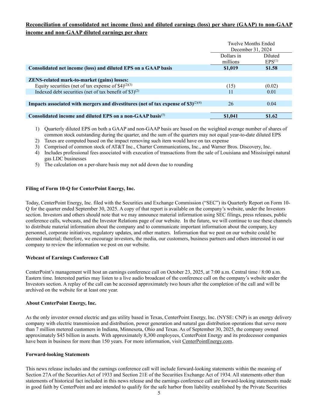 5 Reconciliation of consolidated net income (loss) and diluted earnings (loss) per share (GAAP) to non-GAAP income and non-GAAP diluted earnings per share Twelve Months Ended December 31, 2024 Dollars in millions Diluted EPS(1) Consolidated net income (loss) and diluted EPS on a GAAP basis $1,019 $1.58 ZENS-related mark-to-market (gains) losses: Equity securities (net of tax expense of $4)(2)(3) (15) (0.02) Indexed debt securities (net of tax benefit of $3)(2) 11 0.01 Impacts associated with mergers and divestitures (net of tax expense of $3)(2)(4) 26 0.04 Consolidated income and diluted EPS on a non-GAAP basis(5) $1,041 $1.62 1) Quarterly diluted EPS on both a GAAP and non-GAAP basis are based on the weighted average number of shares of common stock outstanding during the quarter, and the sum of the quarters may not equal year-to-date diluted EPS 2) Taxes are computed based on the impact removing such item would have on tax expense 3) Comprised of common stock of AT&T Inc., Charter Communications, Inc., and Warner Bros. Discovery, Inc. 4) Includes professional fees associated with execution of transactions from the sale of Louisiana and Mississippi natural gas LDC businesses 5) The calculation on a per-share basis may not add down due to rounding Filing of Form 10-Q for CenterPoint Energy, Inc. Today, CenterPoint Energy, Inc. filed with the Securities and Exchange Commission (“SEC”) its Quarterly Report on Form 10- Q for the quarter ended September 30, 2025. A copy of that report is available on the company’s website, under the Investors section. Investors and others should note that we may announce material information using SEC filings, press releases, public conference calls, webcasts, and the Investor Relations page of our website. In the future, we will continue to use these channels to distribute material information about the company and to communicate important information about the company, key personnel, corporate initiatives, regulatory updates, and other matters. Information that we post on our website could be deemed material; therefore, we encourage investors, the media, our customers, business partners and others interested in our company to review the information we post on our website. Webcast of Earnings Conference Call CenterPoint’s management will host an earnings conference call on October 23, 2025, at 7:00 a.m. Central time / 8:00 a.m. Eastern time. Interested parties may listen to a live audio broadcast of the conference call on the company’s website under the Investors section. A replay of the call can be accessed approximately two hours after the completion of the call and will be archived on the website for at least one year. About CenterPoint Energy, Inc. As the only investor owned electric and gas utility based in Texas, CenterPoint Energy, Inc. (NYSE: CNP) is an energy delivery company with electric transmission and distribution, power generation and natural gas distribution operations that serve more than 7 million metered customers in Indiana, Minnesota, Ohio and Texas. As of September 30, 2025, the company owned approximately $45 billion in assets. With approximately 8,300 employees, CenterPoint Energy and its predecessor companies have been in business for more than 150 years. For more information, visit CenterPointEnergy.com. Forward-looking Statements This news release includes and the earnings conference call will include forward-looking statements within the meaning of Section 27A of the Securities Act of 1933 and Section 21E of the Securities Exchange Act of 1934. All statements other than statements of historical fact included in this news release and the earnings conference call are forward-looking statements made in good faith by CenterPoint and are intended to qualify for the safe harbor from liability established by the Private Securities