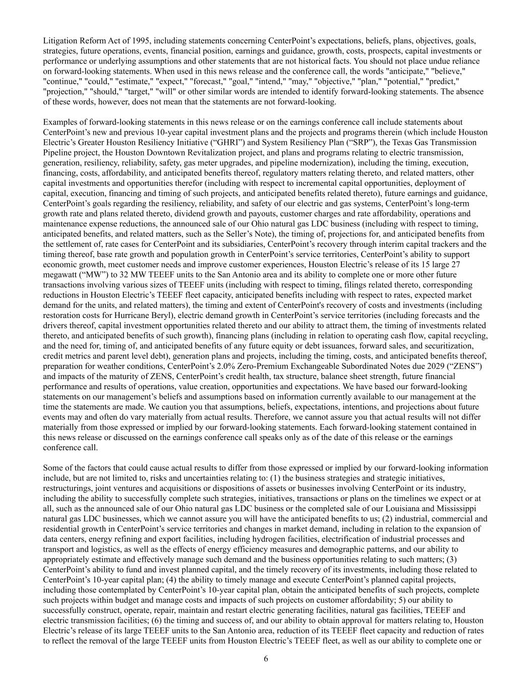 6 Litigation Reform Act of 1995, including statements concerning CenterPoint’s expectations, beliefs, plans, objectives, goals, strategies, future operations, events, financial position, earnings and guidance, growth, costs, prospects, capital investments or performance or underlying assumptions and other statements that are not historical facts. You should not place undue reliance on forward-looking statements. When used in this news release and the conference call, the words "anticipate," "believe," "continue," "could," "estimate," "expect," "forecast," "goal," "intend," "may," "objective," "plan," "potential," "predict," "projection," "should," "target," "will" or other similar words are intended to identify forward-looking statements. The absence of these words, however, does not mean that the statements are not forward-looking. Examples of forward-looking statements in this news release or on the earnings conference call include statements about CenterPoint’s new and previous 10-year capital investment plans and the projects and programs therein (which include Houston Electric’s Greater Houston Resiliency Initiative (“GHRI”) and System Resiliency Plan (“SRP”), the Texas Gas Transmission Pipeline project, the Houston Downtown Revitalization project, and plans and programs relating to electric transmission, generation, resiliency, reliability, safety, gas meter upgrades, and pipeline modernization), including the timing, execution, financing, costs, affordability, and anticipated benefits thereof, regulatory matters relating thereto, and related matters, other capital investments and opportunities therefor (including with respect to incremental capital opportunities, deployment of capital, execution, financing and timing of such projects, and anticipated benefits related thereto), future earnings and guidance, CenterPoint’s goals regarding the resiliency, reliability, and safety of our electric and gas systems, CenterPoint’s long-term growth rate and plans related thereto, dividend growth and payouts, customer charges and rate affordability, operations and maintenance expense reductions, the announced sale of our Ohio natural gas LDC business (including with respect to timing, anticipated benefits, and related matters, such as the Seller’s Note), the timing of, projections for, and anticipated benefits from the settlement of, rate cases for CenterPoint and its subsidiaries, CenterPoint’s recovery through interim capital trackers and the timing thereof, base rate growth and population growth in CenterPoint’s service territories, CenterPoint’s ability to support economic growth, meet customer needs and improve customer experiences, Houston Electric’s release of its 15 large 27 megawatt (“MW”) to 32 MW TEEEF units to the San Antonio area and its ability to complete one or more other future transactions involving various sizes of TEEEF units (including with respect to timing, filings related thereto, corresponding reductions in Houston Electric’s TEEEF fleet capacity, anticipated benefits including with respect to rates, expected market demand for the units, and related matters), the timing and extent of CenterPoint's recovery of costs and investments (including restoration costs for Hurricane Beryl), electric demand growth in CenterPoint’s service territories (including forecasts and the drivers thereof, capital investment opportunities related thereto and our ability to attract them, the timing of investments related thereto, and anticipated benefits of such growth), financing plans (including in relation to operating cash flow, capital recycling, and the need for, timing of, and anticipated benefits of any future equity or debt issuances, forward sales, and securitization, credit metrics and parent level debt), generation plans and projects, including the timing, costs, and anticipated benefits thereof, preparation for weather conditions, CenterPoint’s 2.0% Zero-Premium Exchangeable Subordinated Notes due 2029 (“ZENS”) and impacts of the maturity of ZENS, CenterPoint’s credit health, tax structure, balance sheet strength, future financial performance and results of operations, value creation, opportunities and expectations. We have based our forward-looking statements on our management’s beliefs and assumptions based on information currently available to our management at the time the statements are made. We caution you that assumptions, beliefs, expectations, intentions, and projections about future events may and often do vary materially from actual results. Therefore, we cannot assure you that actual results will not differ materially from those expressed or implied by our forward-looking statements. Each forward-looking statement contained in this news release or discussed on the earnings conference call speaks only as of the date of this release or the earnings conference call. Some of the factors that could cause actual results to differ from those expressed or implied by our forward-looking information include, but are not limited to, risks and uncertainties relating to: (1) the business strategies and strategic initiatives, restructurings, joint ventures and acquisitions or dispositions of assets or businesses involving CenterPoint or its industry, including the ability to successfully complete such strategies, initiatives, transactions or plans on the timelines we expect or at all, such as the announced sale of our Ohio natural gas LDC business or the completed sale of our Louisiana and Mississippi natural gas LDC businesses, which we cannot assure you will have the anticipated benefits to us; (2) industrial, commercial and residential growth in CenterPoint’s service territories and changes in market demand, including in relation to the expansion of data centers, energy refining and export facilities, including hydrogen facilities, electrification of industrial processes and transport and logistics, as well as the effects of ener