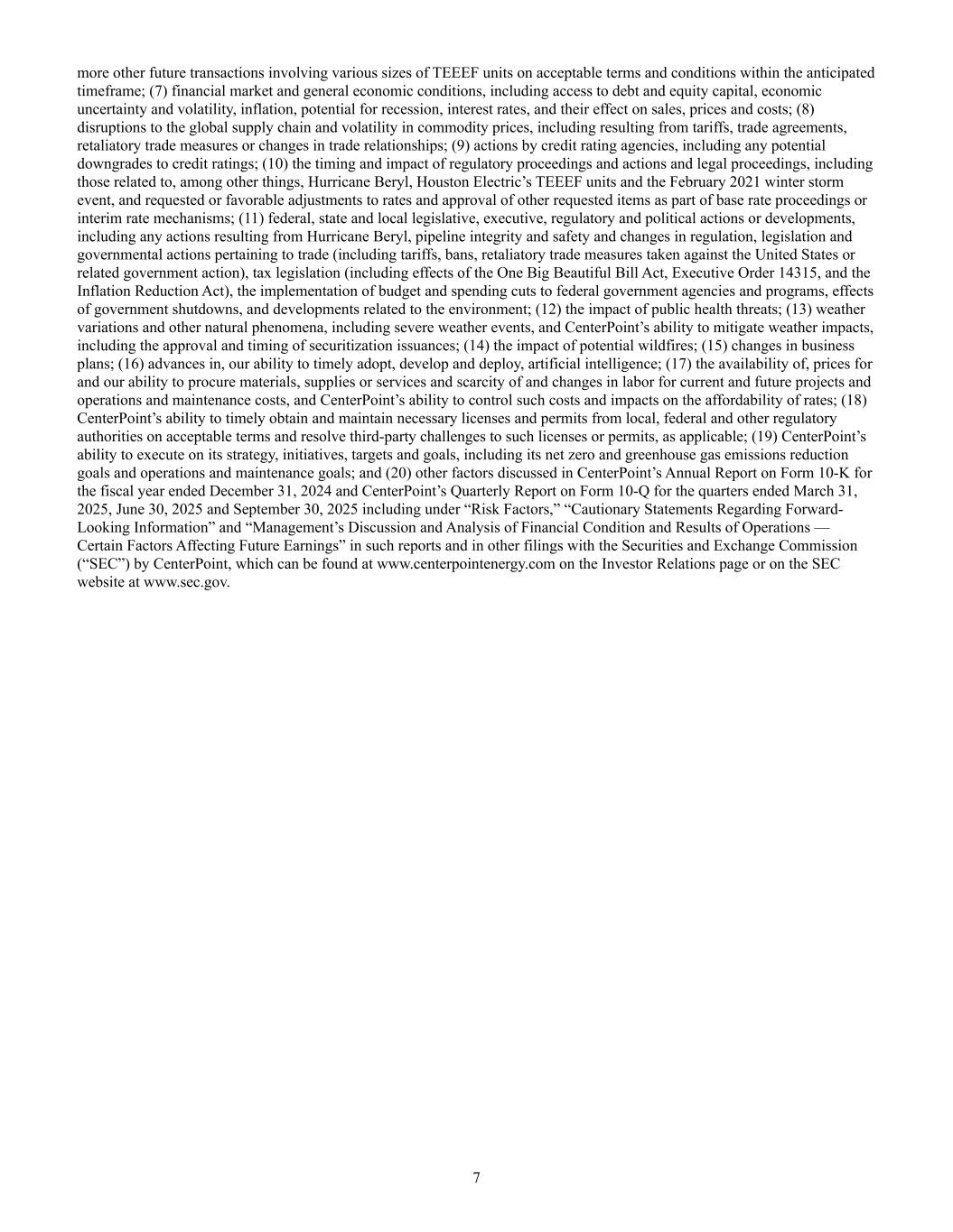 7 more other future transactions involving various sizes of TEEEF units on acceptable terms and conditions within the anticipated timeframe; (7) financial market and general economic conditions, including access to debt and equity capital, economic uncertainty and volatility, inflation, potential for recession, interest rates, and their effect on sales, prices and costs; (8) disruptions to the global supply chain and volatility in commodity prices, including resulting from tariffs, trade agreements, retaliatory trade measures or changes in trade relationships; (9) actions by credit rating agencies, including any potential downgrades to credit ratings; (10) the timing and impact of regulatory proceedings and actions and legal proceedings, including those related to, among other things, Hurricane Beryl, Houston Electric’s TEEEF units and the February 2021 winter storm event, and requested or favorable adjustments to rates and approval of other requested items as part of base rate proceedings or interim rate mechanisms; (11) federal, state and local legislative, executive, regulatory and political actions or developments, including any actions resulting from Hurricane Beryl, pipeline integrity and safety and changes in regulation, legislation and governmental actions pertaining to trade (including tariffs, bans, retaliatory trade measures taken against the United States or related government action), tax legislation (including effects of the One Big Beautiful Bill Act, Executive Order 14315, and the Inflation Reduction Act), the implementation of budget and spending cuts to federal government agencies and programs, effects of government shutdowns, and developments related to the environment; (12) the impact of public health threats; (13) weather variations and other natural phenomena, including severe weather events, and CenterPoint’s ability to mitigate weather impacts, including the approval and timing of securitization issuances; (14) the impact of potential wildfires; (15) changes in business plans; (16) advances in, our ability to timely adopt, develop and deploy, artificial intelligence; (17) the availability of, prices for and our ability to procure materials, supplies or services and scarcity of and changes in labor for current and future projects and operations and maintenance costs, and CenterPoint’s ability to control such costs and impacts on the affordability of rates; (18) CenterPoint’s ability to timely obtain and maintain necessary licenses and permits from local, federal and other regulatory authorities on acceptable terms and resolve third-party challenges to such licenses or permits, as applicable; (19) CenterPoint’s ability to execute on its strategy, initiatives, targets and goals, including its net zero and greenhouse gas emissions reduction goals and operations and maintenance goals; and (20) other factors discussed in CenterPoint’s Annual Report on Form 10-K for the fiscal year ended December 31, 2024 and CenterPoint’s Quarterly Report on Form 10-Q for the quarters ended March 31, 2025, June 30, 2025 and September 30, 2025 including under “Risk Factors,” “Cautionary Statements Regarding Forward- Looking Information” and “Management’s Discussion and Analysis of Financial Condition and Results of Operations — Certain Factors Affecting Future Earnings” in such reports and in other filings with the Securities and Exchange Commission (“SEC”) by CenterPoint, which can be found at www.centerpointenergy.com on the Investor Relations page or on the SEC website at www.sec.gov.