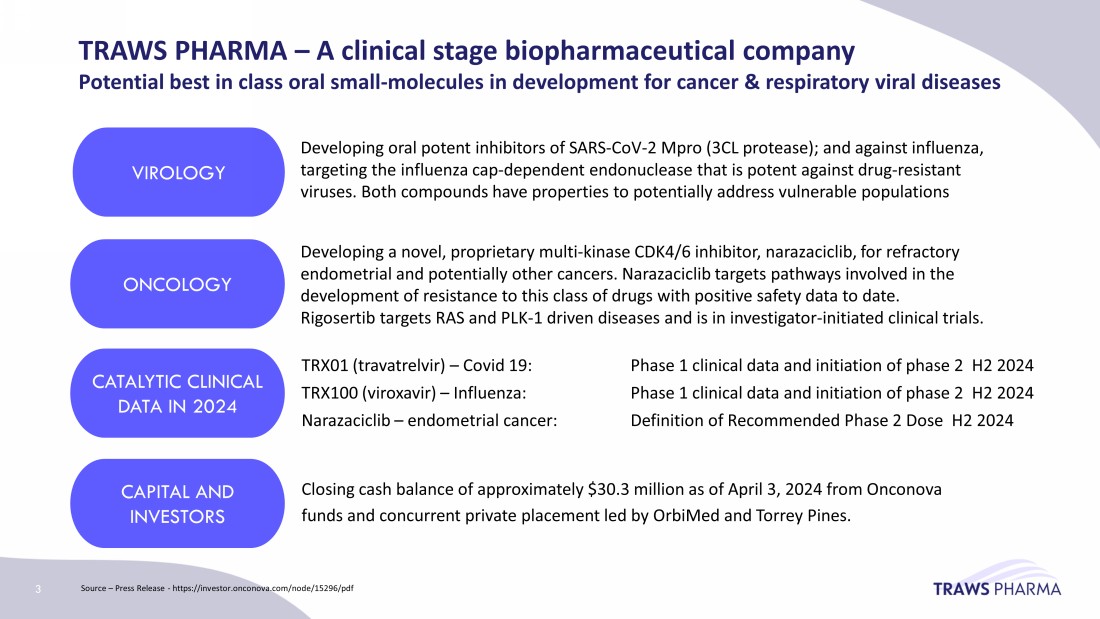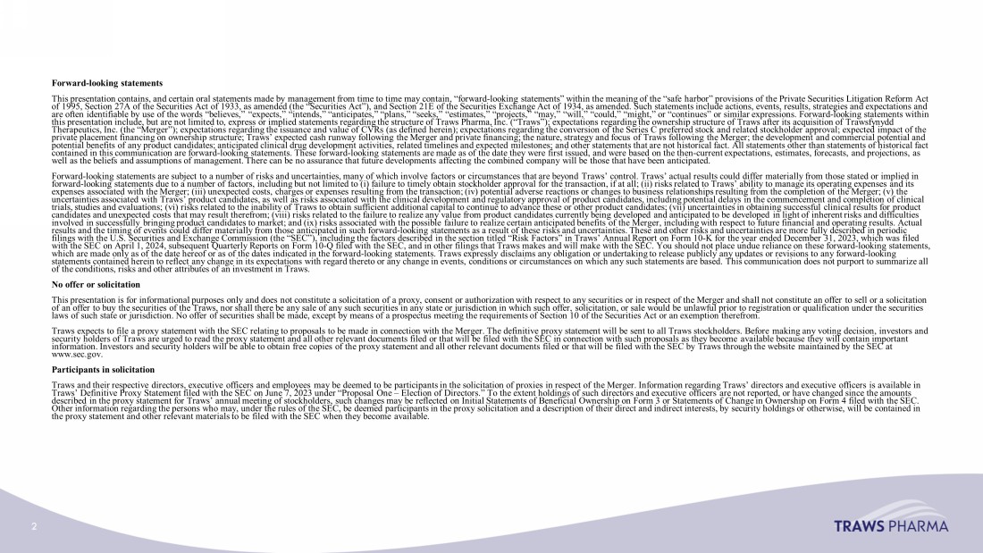 Forward - looking statements This presentation contains, and certain oral statements made by management from time to time may contain, “forward - looking state ments” within the meaning of the “safe harbor” provisions of the Private Securities Litigation Reform Act of 1995, Section 27A of the Securities Act of 1933, as amended (the “Securities Act”), and Section 21E of the Securities Exch ang e Act of 1934, as amended. Such statements include actions, events, results, strategies and expectations and are often identifiable by use of the words “believes,” “expects,” “intends,” “anticipates,” “plans,” “seeks,” “estimates,” “p roj ects,” “may,” “will,” “could,” “might,” or “continues” or similar expressions. Forward - looking statements within this presentation include, but are not limited to, express or implied statements regarding the structure of Traws Pharma, Inc. (“ Traws ”); expectations regarding the ownership structure of Traws after its acquisition of Trawsfynydd Therapeutics, Inc. (the “Merger”); expectations regarding the issuance and value of CVRs (as defined herein); expectations re gar ding the conversion of the Series C preferred stock and related stockholder approval; expected impact of the private placement financing on ownership structure; Traws ’ expected cash runway following the Merger and private financing; the nature, strategy and focus of Traws following the Merger; the development and commercial potential and potential benefits of any product candidates; anticipated clinical drug development activities, related timelines and expecte d m ilestones; and other statements that are not historical fact. All statements other than statements of historical fact contained in this communication are forward - looking statements. These forward - looking statements are made as of the date they we re first issued, and were based on the then - current expectations, estimates, forecasts, and projections, as well as the beliefs and assumptions of management. There can be no assurance that future developments affecting the combined com pany will be those that have been anticipated. Forward - looking statements are subject to a number of risks and uncertainties, many of which involve factors or circumstances th at are beyond Traws ’ control. Traws ’ actual results could differ materially from those stated or implied in forward - looking statements due to a number of factors, including but not limited to ( i ) failure to timely obtain stockholder approval for the transaction, if at all; (ii) risks related to Traws ’ ability to manage its operating expenses and its expenses associated with the Merger; (iii) unexpected costs, charges or expenses resulting from the transaction; (iv) potenti al adverse reactions or changes to business relationships resulting from the completion of the Merger; (v) the uncertainties associated with Traws ’ product candidates, as well as risks associated with the clinical development and regulatory approval of product candidates , i ncluding potential delays in the commencement and completion of clinical trials, studies and evaluations; (vi) risks related to the inability of Traws to obtain sufficient additional capital to continue to advance these or other product candidates; (vii) uncertainties in obta in ing successful clinical results for product candidates and unexpected costs that may result therefrom; (viii) risks related to the failure to realize any value from prod uct candidates currently being developed and anticipated to be developed in light of inherent risks and difficulties involved in successfully bringing product candidates to market; and (ix) risks associated with the possible failure to realiz e c ertain anticipated benefits of the Merger, including with respect to future financial and operating results. Actual results and the timing of events could differ materially from those anticipated in such forward - looking statements as a result o f these risks and uncertainties. These and other risks and uncertainties are more fully described in periodic filings with the U.S. Securities and Exchange Commission (the “SEC”), including the factors described in the section titled “ Ris k Factors” in Traws ’ Annual Report on Form 10 - K for the year ended December 31, 2023, which was filed with the SEC on April 1, 2024, subsequent Quarterly Reports on Form 10 - Q filed with the SEC, and in other filings that Traws makes and will make with the SEC. You should not place undue reliance on these forward - looking statements, which are made only as of the date hereof or as of the dates indicated in the forward - looking statements. Traws expressly disclaims any obligation or undertaking to release publicly any updates or revisions to any forward - looking statements contained herein to reflect any change in its expectations with regard thereto or any change in events, conditions or circumstances on which any such statements are based. This communication does not purport to summarize all of the conditions, risks and other attributes of an investment in Traws . No offer or solicitation This presentation is for informational purposes only and does not constitute a solicitation of a proxy, consent or authorizat ion with respect to any securities or in respect of the Merger and shall not constitute an offer to sell or a solicitation of an offer to buy the securities of the Traws , nor shall there be any sale of any such securities in any state or jurisdiction in which such offer, solicitation, or sale wou ld be unlawful prior to registration or qualification under the securities laws of such state or jurisdiction. No offer of securities shall be made, except by means of a prospectus meeting the require men ts of Section 10 of the Securities Act or an exemption therefrom. Traws expects to file a proxy statement with the SEC relating to proposals to be made in connection with