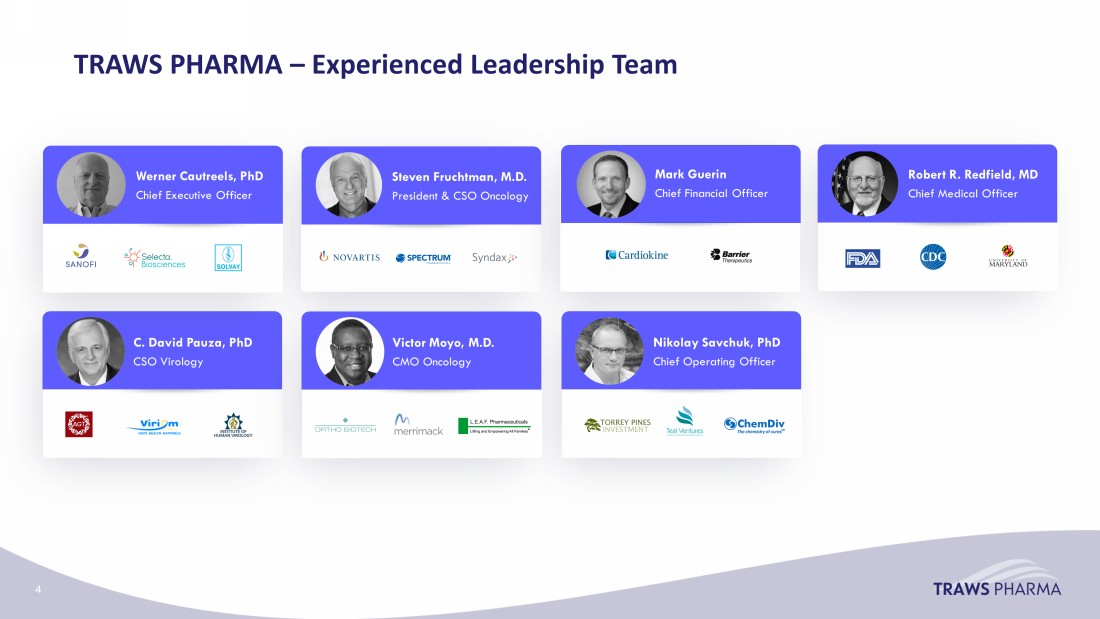 Closing cash balance of approximately $30.3 million as of April 3, 2024 from Onconova funds and concurrent private placement led by OrbiMed and Torrey Pines. TRX01 ( t ravatrelvir ) – Covid 19: Phase 1 clinical data and initiation of phase 2 H2 2024 TRX100 ( v iroxavir ) – Influenza: Phase 1 clinical data and initiation of phase 2 H2 2024 Narazaciclib – endometrial cancer: Definition of Recommended Phase 2 Dose H2 2024 TRAWS PHARMA – A clinical stage biopharmaceutical company Potential best in class oral small - molecules in development for cancer & respiratory viral diseases VIROLOGY ONCOLOGY CATALYTIC CLINICAL DATA IN 2024 CAPITAL AND INVESTORS D eveloping oral potent inhibitors of SARS - CoV - 2 Mpro (3CL protease); and against influenza, targeting the influenza cap - dependent endonuclease that is potent against drug - resistant viruses. Both compounds have properties to potentially address vulnerable populations D eveloping a novel, proprietary multi - kinase CDK4/6 inhibitor, narazaciclib , for refractory endometrial and potentially other cancers. Narazaciclib targets pathways involved in the development of resistance to this class of drugs with positive safety data to date. Rigosertib targets RAS and PLK - 1 driven diseases and is in investigator - initiated clinical trials. Source – Press Release - https://investor.onconova.com/node/15296/pdf 3