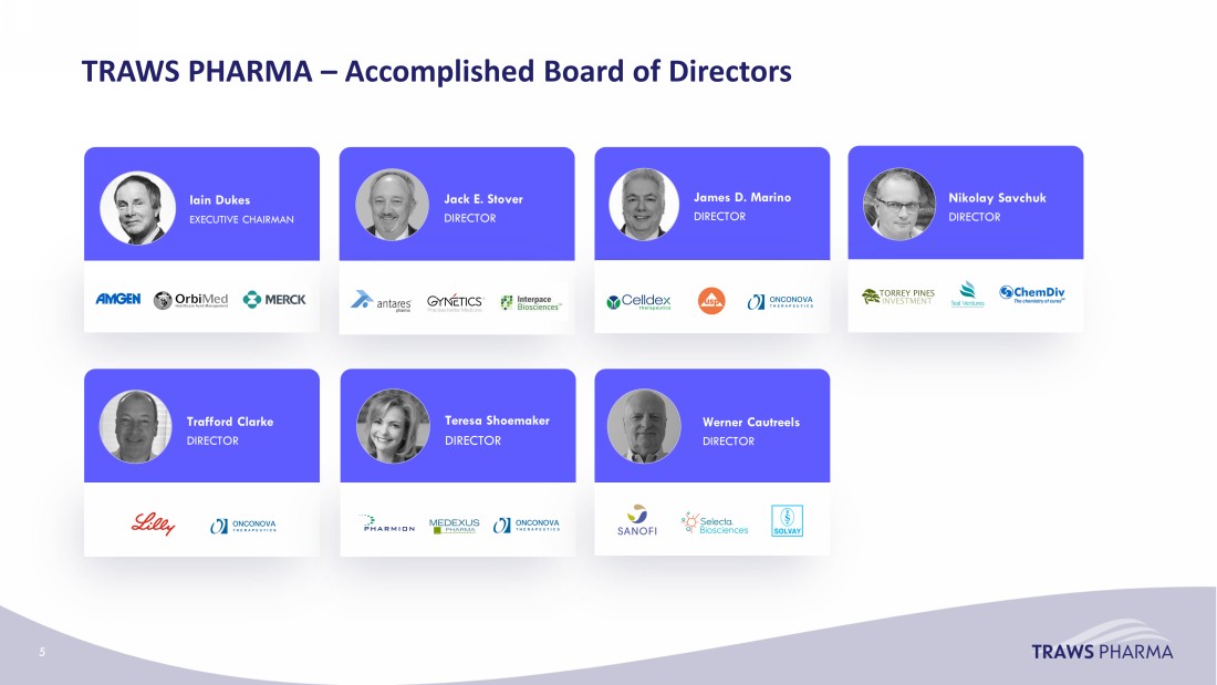 TRAWS PHARMA – Experienced Leadership Team Steven Fruchtman , M.D. President & CSO Oncology Robert R. Redfield, MD Chief Medical Officer C. David Pauza , PhD CSO Virology Nikolay Savchuk , PhD Chief Operating Officer Werner Cautreels , PhD Chief Executive Officer Mark Guerin Chief Financial Officer 4 Victor Moyo , M.D. CMO Oncology