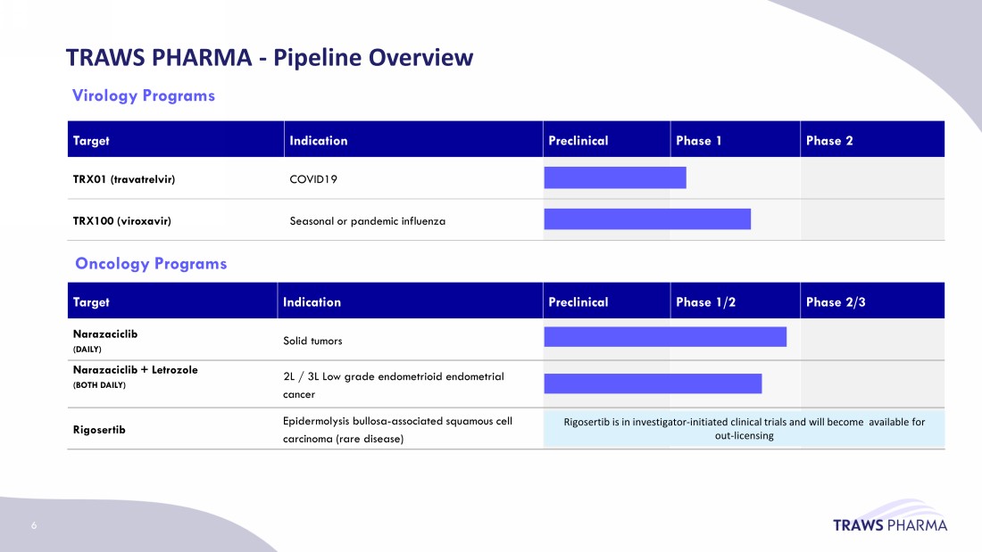 TRAWS PHARMA – Accomplished Board of Directors James D. Marino DIRECTOR Management Scientific Advisory Board Jack E. Stover DIRECTOR Iain Dukes EXECUTIVE CHAIRMAN Nikolay Savchuk DIRECTOR Trafford Clarke DIRECTOR Werner Cautreels DIRECTOR Teresa Shoemaker DIRECTOR 5