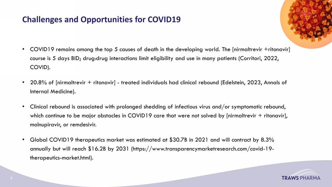 Challenges and Opportunities for COVID19 • COVID19 remains among the top 5 causes of death in the developing world. The [ nirmaltrevir +ritonavir] course is 5 days BID; drug:drug interactions limit eligibility and use in many patients (Corritori, 2022, COVID). • 20.8% of [ nirmaltrevir + ritonavir] - treated individuals had clinical rebound (Edelstein, 2023, Annals of Internal Medicine). • Clinical rebound is associated with prolonged shedding of infectious virus and/or symptomatic rebound, which continue to be major obstacles in COVID19 care that were not solved by [ nirmaltrevir + ritonavir], molnupiravir , or remdesivir. • Global COVID19 therapeutics market was estimated at $30.7B in 2021 and will contract by 8.3% annually but will reach $16.2B by 2031 ( https://www.transparencymarketresearch.com/covid - 19 - therapeutics - market.html). 8 8