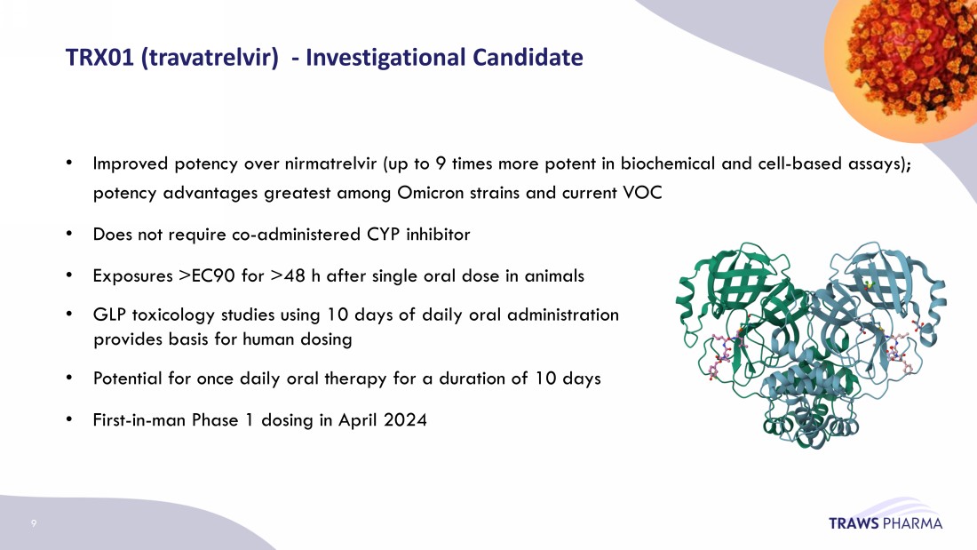 • Improved potency over nirmatrelvir (up to 9 times more potent in biochemical and cell - based assays); potency advantages greatest among Omicron strains and current VOC • Does not require co - administered CYP inhibitor • Exposures >EC90 for >48 h after single oral dose in animals • GLP toxicology studies using 10 days of daily oral administration provides basis for human dosing • Potential for once daily oral therapy for a duration of 10 days • First - in - man Phase 1 dosing in April 2024 TRX01 ( travatrelvir ) - Investigational Candidate 9
