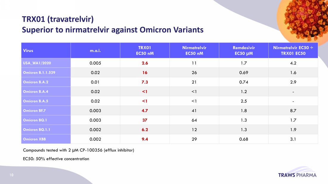 Virus m.o.i . TRX01 EC50 nM Nirmatrelvir EC50 nM Remdesivir EC50 µM Nirmatrelvir EC50 ÷ TRX01 EC50 USA_WA1/2020 0.005 2.6 11 1.7 4.2 Omicron B.1.1.529 0.02 16 26 0.69 1.6 Omicron B.A.2 0.01 7.3 21 0.74 2.9 Omicron B.A.4 0.02 <1 <1 1.2 - Omicron B.A.5 0.02 <1 <1 2.5 - Omicron BF.7 0.003 4.7 41 1.8 8.7 Omicron BQ.1 0.003 37 64 1.3 1.7 Omicron BQ.1.1 0.002 6.2 12 1.3 1.9 Omicron XBB 0.002 9.4 29 0.68 3.1 Compounds tested with 2 µM CP - 100356 (efflux inhibitor) EC50: 50% effective concentration 10 TRX01 ( travatrelvir ) Superior to nirmatrelvir against Omicron Variants 10