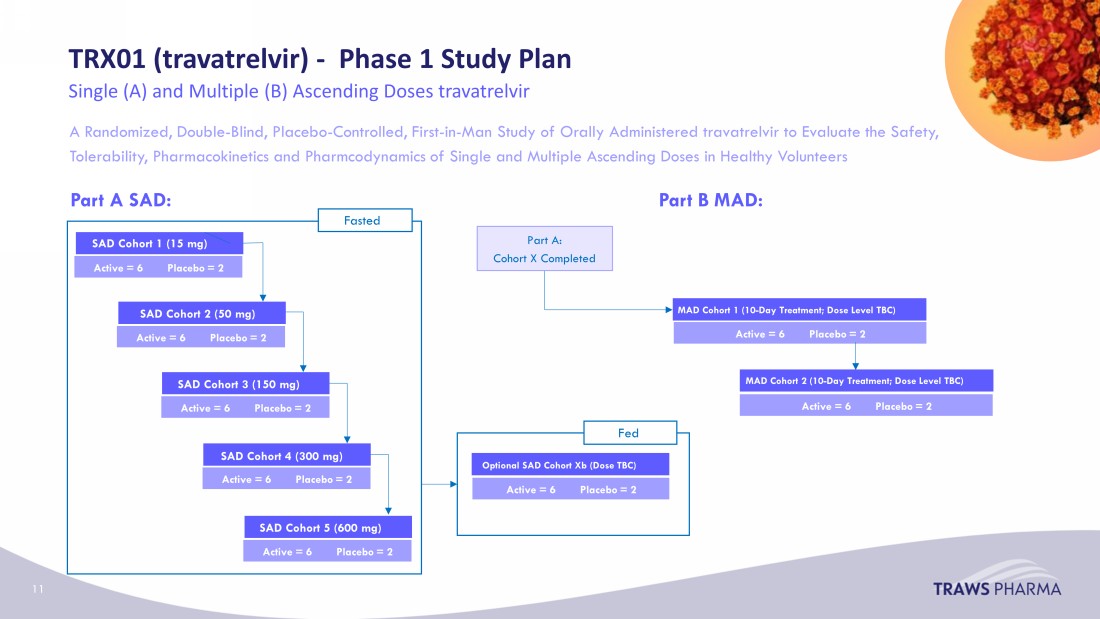 A Randomized, Double - Blind, Placebo - Controlled, First - in - Man Study of Orally Administered travatrelvir to Evaluate the Safety, Tolerability, Pharmacokinetics and Pharmcodynamics of Single and Multiple Ascending Doses in Healthy Volunteers TRX01 ( travatrelvir ) - Phase 1 Study Plan Single (A) and Multiple (B) Ascending Doses travatrelvir SAD Cohort 1 (15 mg) Active = 6 Placebo = 2 SAD Cohort 2 (50 mg) Sentinels Active (1) : Placebo (1) Main group Active (5) : Placebo (1) SAD Cohort 3 (150 mg) Sentinels Active (1) : Placebo (1) Main group Active (5) : Placebo (1) Sentinels Active (1) : Placebo (1) SAD Cohort 4 (300 mg) SAD Cohort 5 (600 mg) Sentinels Active (1) : Placebo (1) Main group Active (5) : Placebo (1) Optional SAD Cohort Xb (Dose TBC) MAD Cohort 1 (10 - Day Treatment; Dose Level TBC) MAD Cohort 2 (10 - Day Treatment; Dose Level TBC) Fasted Fed Part A SAD: Part B MAD: Part A: Cohort X Completed Active = 6 Placebo = 2 Active = 6 Placebo = 2 Active = 6 Placebo = 2 Active = 6 Placebo = 2 Active = 6 Placebo = 2 Active = 6 Placebo = 2 Active = 6 Placebo = 2 11