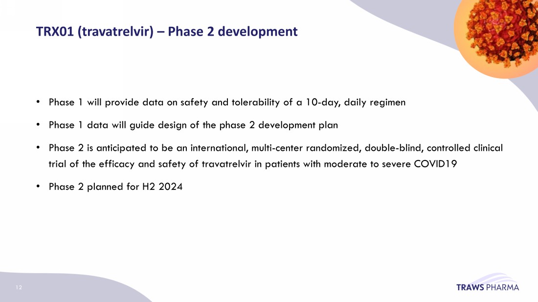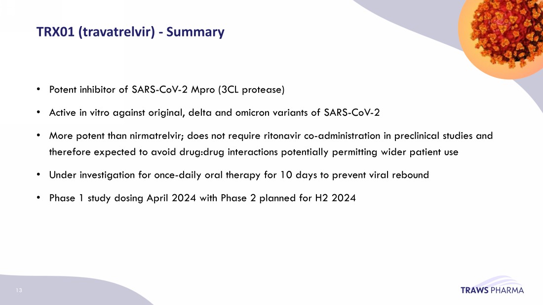 • Phase 1 will provide data on safety and tolerability of a 10 - day, daily regimen • Phase 1 data will guide design of the phase 2 development plan • Phase 2 is anticipated to be an international, multi - center randomized, double - blind, controlled clinical trial of the efficacy and safety of travatrelvir in patients with moderate to severe COVID19 • Phase 2 planned for H2 20 24 TRX01 ( travatrelvir ) – Phase 2 development 12