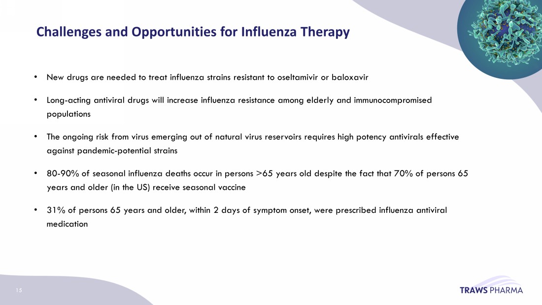 Challenges and Opportunities for Influenza Therapy • New drugs are needed to treat influenza strains resistant to oseltamivir or baloxavir • Long - acting antiviral drugs will increase influenza resistance among elderly and immunocompromised populations • The ongoing risk from virus emerging out of natural virus reservoirs requires high potency antivirals effective against pandemic - potential strains • 80 - 90% of seasonal influenza deaths occur in persons >65 years old despite the fact that 70% of persons 65 years and older (in the US) receive seasonal vaccine • 31% of persons 65 years and older, within 2 days of symptom onset, were prescribed influenza antiviral medication 15