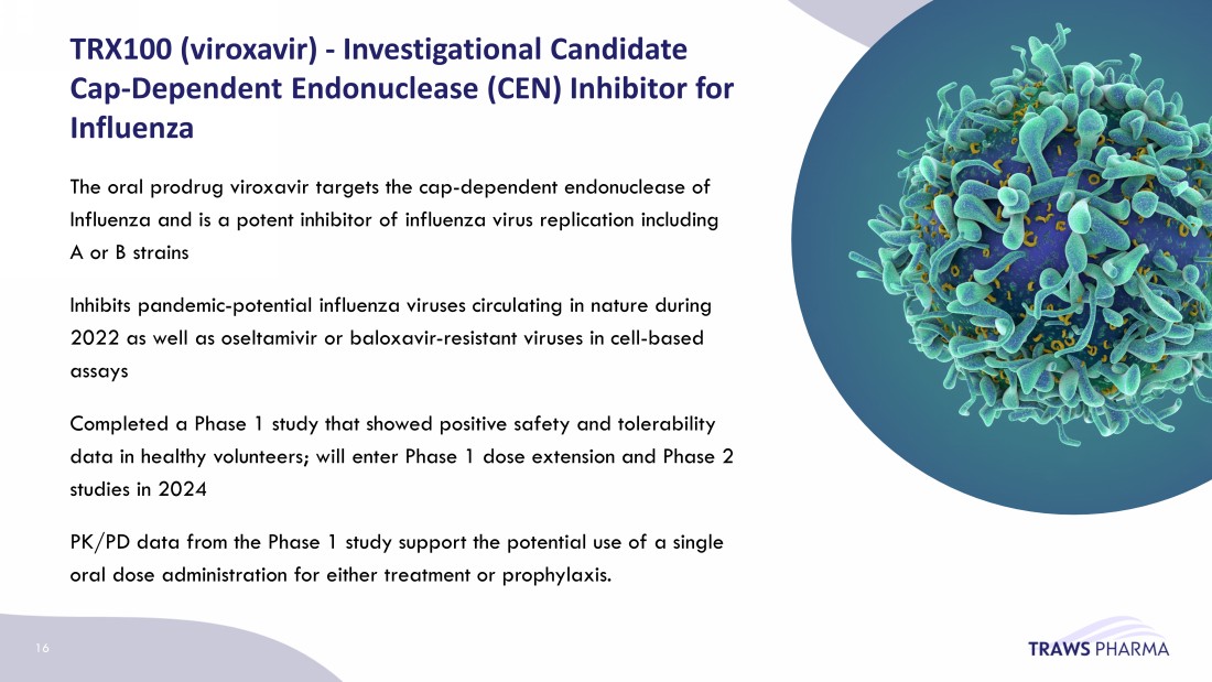 TRX100 ( viroxavir ) - Investigational Candidate Cap - Dependent Endonuclease (CEN) Inhibitor for Influenza 16 The oral prodrug viroxavir targets the cap - dependent endonuclease of Influenza and is a potent inhibitor of influenza virus replication including A or B strains I nhibits pandemic - potential influenza viruses circulating in nature during 2022 as well as oseltamivir or baloxavir - resistant viruses in cell - based assays C ompleted a Phase 1 study that showed positive safety and tolerability data in healthy volunteers; will enter Phase 1 dose extension and Phase 2 studies in 2024 PK/PD data from the Phase 1 study support the potential use of a single oral dose administration for either treatment or prophylaxis.