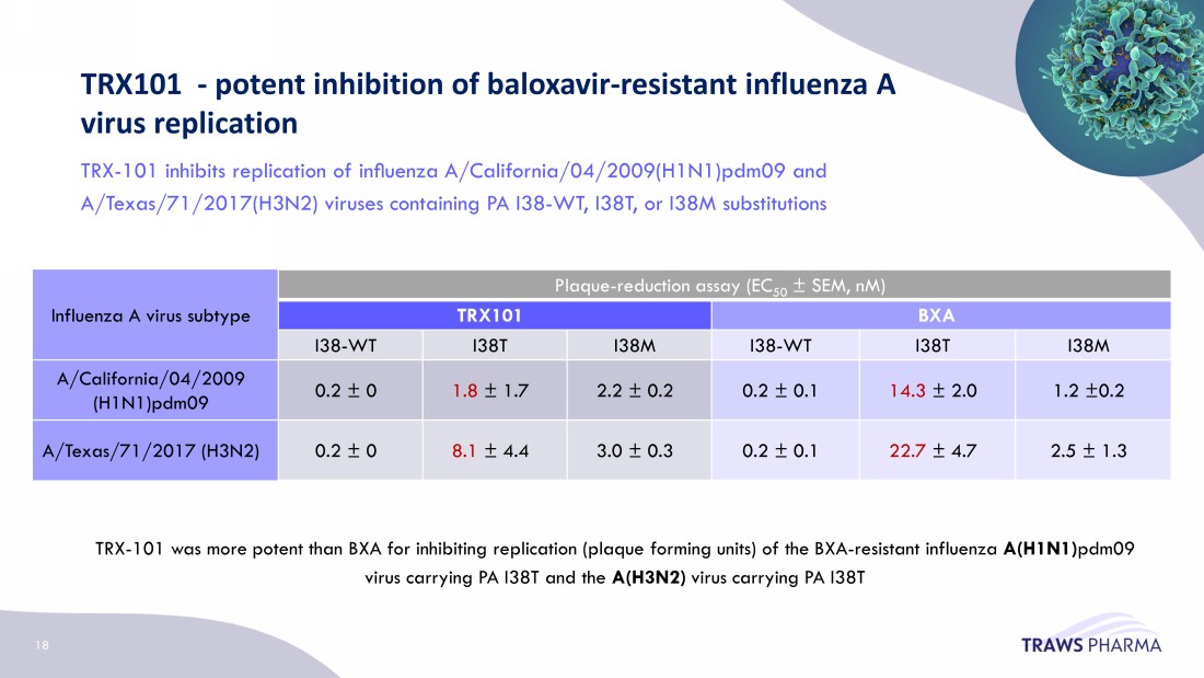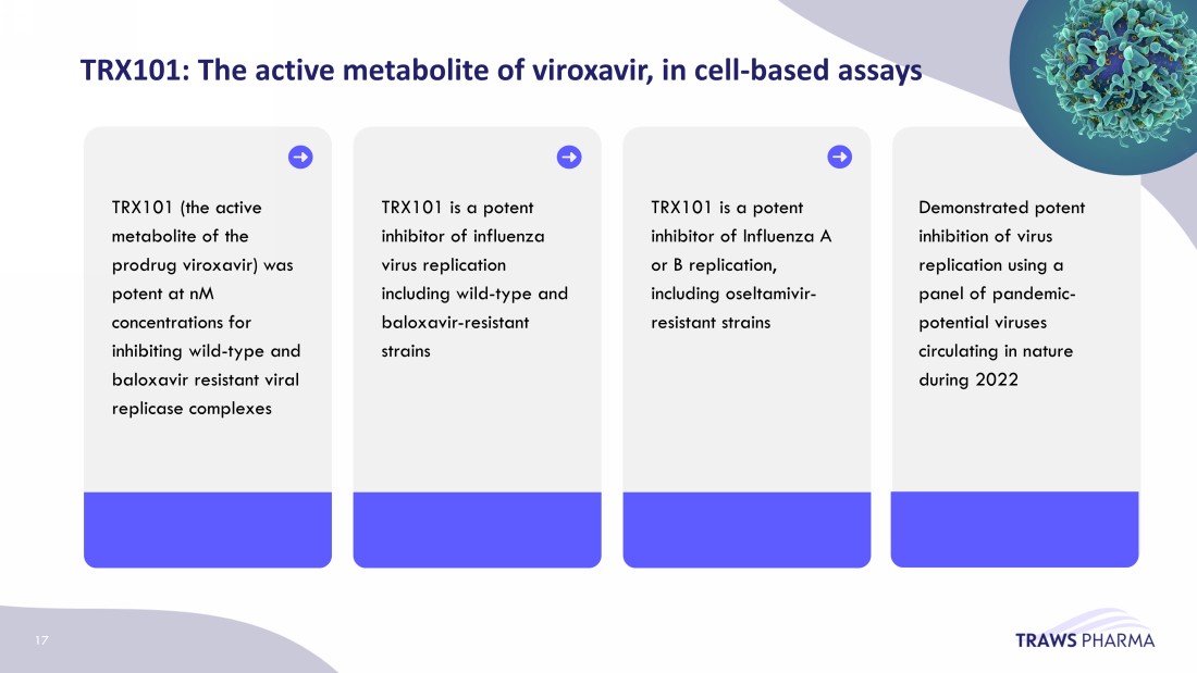 TRX101: The active metabolite of viroxavir , in cell - based assays 17 TRX101 (the active metabolite of the prodrug v iroxavir ) was potent at nM concentrations for inhibiting wild - type and baloxavir resistant viral replicase complexes TRX101 is a potent inhibitor of influenza virus replication including wild - type and baloxavir - resistant strains TRX101 is a potent inhibitor of Influenza A or B replication, including oseltamivir - resistant strains D emonstrated potent inhibition of virus replication using a panel of pandemic - potential viruses circulating in nature during 2022 17