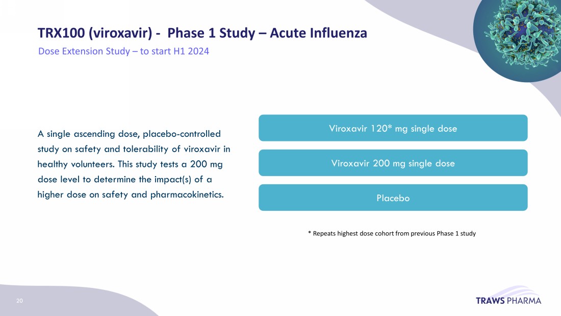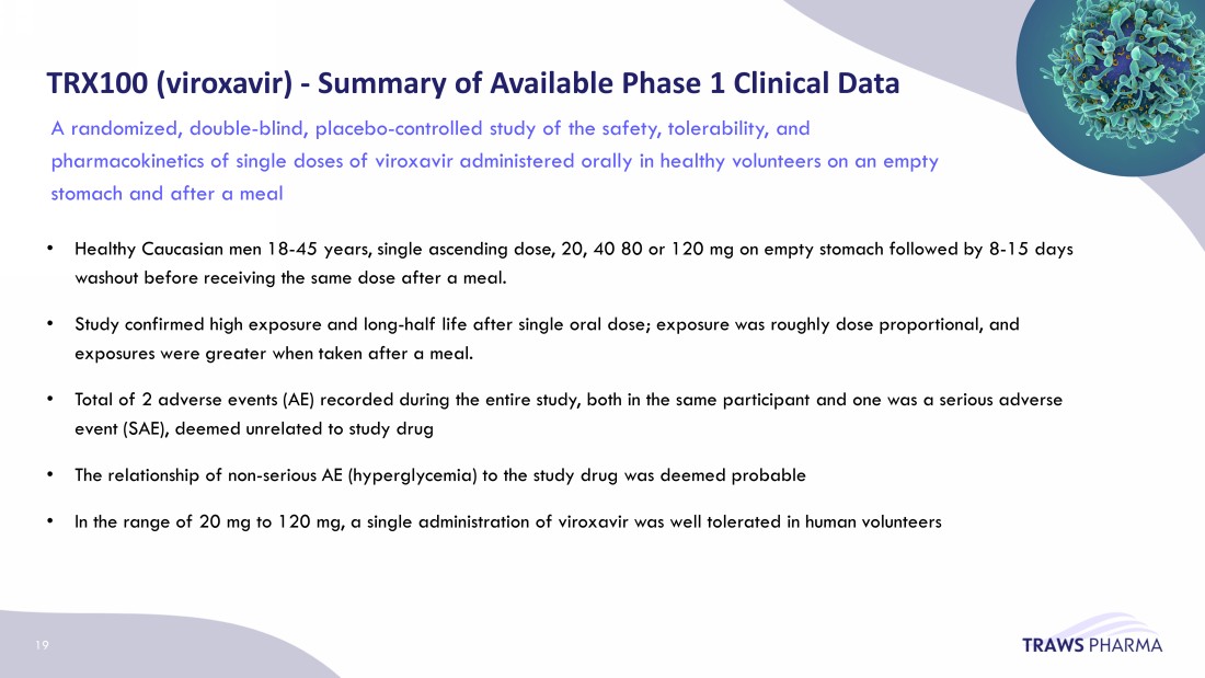 TRX100 ( viroxavir ) - Summary of Available Phase 1 Clinical Data • Healthy Caucasian men 18 - 45 years, single ascending dose, 20, 40 80 or 120 mg on empty stomach followed by 8 - 15 days washout before receiving the same dose after a meal. • Study confirmed high exposure and long - half life after single oral dose; exposure was roughly dose proportional, and exposures were greater when taken after a meal. • Total of 2 adverse events (AE) recorded during the entire study, both in the same participant and one was a serious adverse event (SAE), deemed unrelated to study drug • The relationship of non - serious AE (hyperglycemia) to the study drug was deemed probable • I n the range of 20 mg to 120 mg, a single administration of viroxavir was well tolerated in human volunteers A randomized, double - blind, placebo - controlled study of the safety, tolerability, and pharmacokinetics of single doses of viroxavir administered orally in healthy volunteers on an empty stomach and after a meal 19