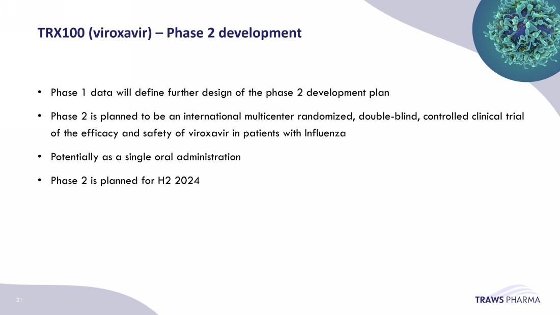 TRX100 ( viroxavir ) - Phase 1 Study – Acute Influenza Dose Extension Study – to start H1 2024 * Repeats highest dose cohort from previous Phase 1 study A single ascending dose, placebo - controlled study on safety and tolerability of viroxavir in healthy volunteers. This study tests a 200 mg dose level to determine the impact(s) of a higher dose on safety and pharmacokinetics. Viroxavir 120* mg single dose Viroxavir 200 mg single dose Placebo 20
