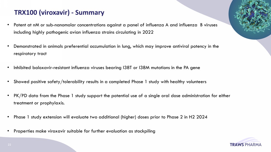 • Phase 1 data will define further design of the phase 2 development plan • Phase 2 is planned to be an international multicenter randomized, double - blind, controlled clinical trial of the efficacy and safety of viroxavir in patients with Influenza • Potentially as a single oral administration • Phase 2 is planned for H2 20 24 TRX100 ( viroxavir ) – Phase 2 development 21