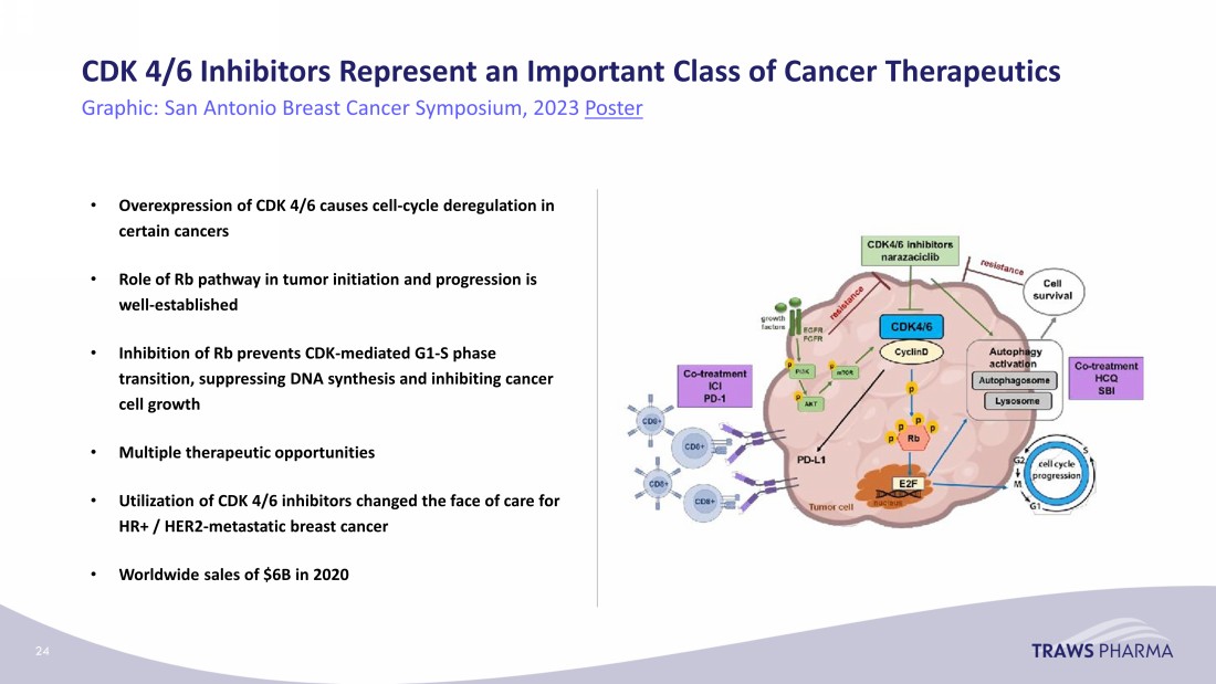 CDK 4/6 Inhibitors Represent an Important Class of Cancer Therapeutics Graphic: San Antonio Breast Cancer Symposium, 2023 Poster • Overexpression of CDK 4/6 causes cell - cycle deregulation in certain cancers • Role of Rb pathway in tumor initiation and progression is well - established • Inhibition of Rb prevents CDK - mediated G1 - S phase transition, suppressing DNA synthesis and inhibiting cancer cell growth • Multiple therapeutic opportunities • Utilization of CDK 4/6 inhibitors changed the face of care for HR+ / HER2 - metastatic breast cancer • Worldwide sales of $6B in 2020 24
