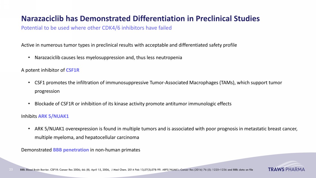 Narazaciclib has Demonstrated Differentiation in Preclinical Studies Active in numerous tumor types in preclinical results with acceptable and differentiated safety profile • Narazaciclib causes less myelosuppression and, thus less neutropenia A potent inhibitor of CSF1R • CSF1 promotes the infiltration of immunosuppressive Tumor - Associated Macrophages (TAMs), which support tumor progression • Blockade of CSF1R or inhibition of its kinase activity promote antitumor immunologic effects Inhibits ARK 5/NUAK1 • ARK 5/NUAK1 overexpression is found in multiple tumors and is associated with poor prognosis in metastatic breast cancer, multiple myeloma, and hepatocellular carcinoma Demonstrated BBB penetration in non - human primates Potential to be used where other CDK4/6 inhibitors have failed BBB: Blood Brain Barrier. CSF1R: Cancer Res 2006; 66: (8). April 15, 2006, J Med Chem. 2014 Feb 13;57(3):578 - 99. ARF5/NUAK1: Cancer Res (2016) 76 (5): 1225 – 1236 and BBB: data on file 25