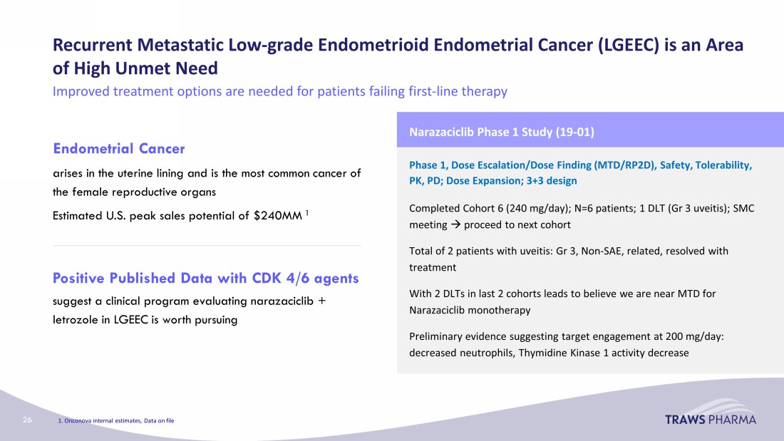 Recurrent Metastatic Low - grade Endometrioid Endometrial Cancer (LGEEC) is an Area of High Unmet Need Improved treatment options are needed for patients failing first - line therapy Phase 1, Dose Escalation/Dose Finding (MTD/RP2D), Safety, Tolerability, PK, PD; Dose Expansion; 3+3 design Completed Cohort 6 (240 mg/day); N=6 patients; 1 DLT (Gr 3 uveitis); SMC meeting proceed to next cohort Total of 2 patients with uveitis: Gr 3, Non - SAE, related, resolved with treatment With 2 DLTs in last 2 cohorts leads to believe we are near MTD for Narazaciclib monotherapy Preliminary evidence suggesting target engagement at 200 mg/day: decreased neutrophils, Thymidine Kinase 1 activity decrease Endometrial Cancer arises in the uterine lining and is the most common cancer of the female reproductive organs Estimated U.S. peak sales potential of $240MM 1 Positive Published Data with CDK 4/6 agents suggest a clinical program evaluating narazaciclib + letrozole in LGEEC is worth pursuing Narazaciclib Phase 1 Study (19 - 01 ) 1. Onconova internal estimates, Data on file 26