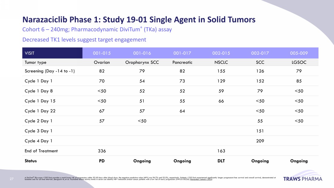 Narazaciclib Phase 1: Study 19 - 01 Single Agent in Solid Tumors VISIT 001 - 015 001 - 016 001 - 017 002 - 015 002 - 017 005 - 009 Tumor type Ovarian Oropharynx SCC Pancreatic NSCLC SCC LGSOC Screening (Day - 14 to - 1) 82 79 82 155 126 79 Cycle 1 Day 1 70 54 73 129 152 85 Cycle 1 Day 8 <50 52 52 59 79 <50 Cycle 1 Day 15 <50 51 55 66 <50 <50 Cycle 1 Day 22 67 57 64 <50 <50 Cycle 2 Day 1 57 <50 55 <50 Cycle 3 Day 1 151 Cycle 4 Day 1 209 End of Treatment 336 163 Status PD Ongoing Ongoing DLT Ongoing Ongoing Cohort 6 – 240mg; Pharmacodynamic DiviTum ® ( TKa ) assay Decreased TK1 levels suggest target engagement A DiviTum ® TKa score <250 DuA provides a much lower risk of progression within 30/60   days after blood draw, the negative predictive value (NPV) was 96.7% and 93.5%, respectively. Patients <250 DuA experienced significantly longer progression - free survival and overall survival, demonstrated at baseline and for all time intervals. (Bergqvist M, et al. Thymidine kinase activity levels in serum can identify HR+ metastat ic breast cancer patients with a low risk of early progression (SWOG S0226). Biomarkers January 2023 ) 27
