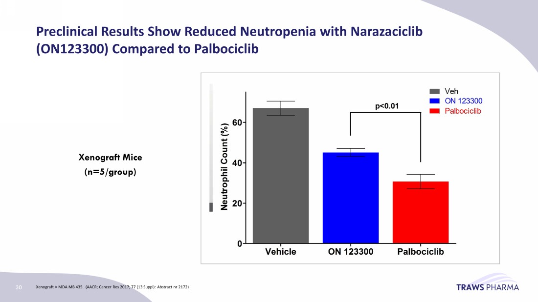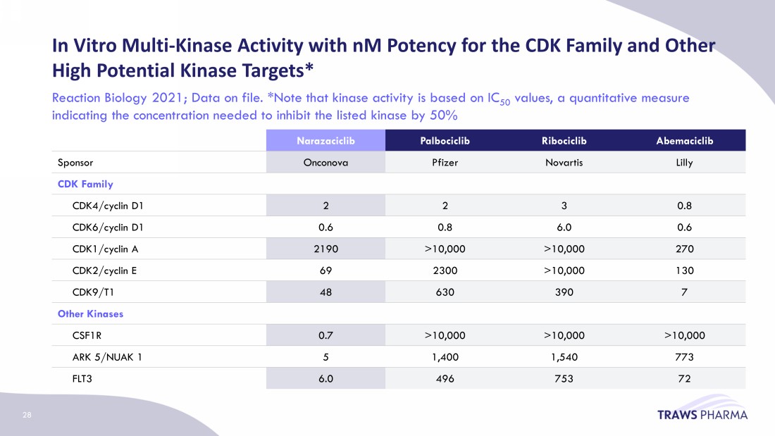 In Vitro Multi - Kinase Activity with nM Potency for the CDK Family and Other High Potential Kinase Targets* Reaction Biology 2021; Data on file. *Note that kinase activity is based on IC 50 values, a quantitative measure indicating the concentration needed to inhibit the listed kinase by 50% Narazaciclib Palbociclib Ribociclib Abemaciclib Sponsor Onconova Pfizer Novartis Lilly CDK Family CDK4/cyclin D1 2 2 3 0.8 CDK6/cyclin D1 0.6 0.8 6.0 0.6 CDK1/cyclin A 2190 >10,000 >10,000 270 CDK2/cyclin E 69 2300 >10,000 130 CDK9/T1 48 630 390 7 Other Kinases CSF1R 0.7 >10,000 >10,000 >10,000 ARK 5/NUAK 1 5 1,400 1,540 773 FLT3 6.0 496 753 72 28