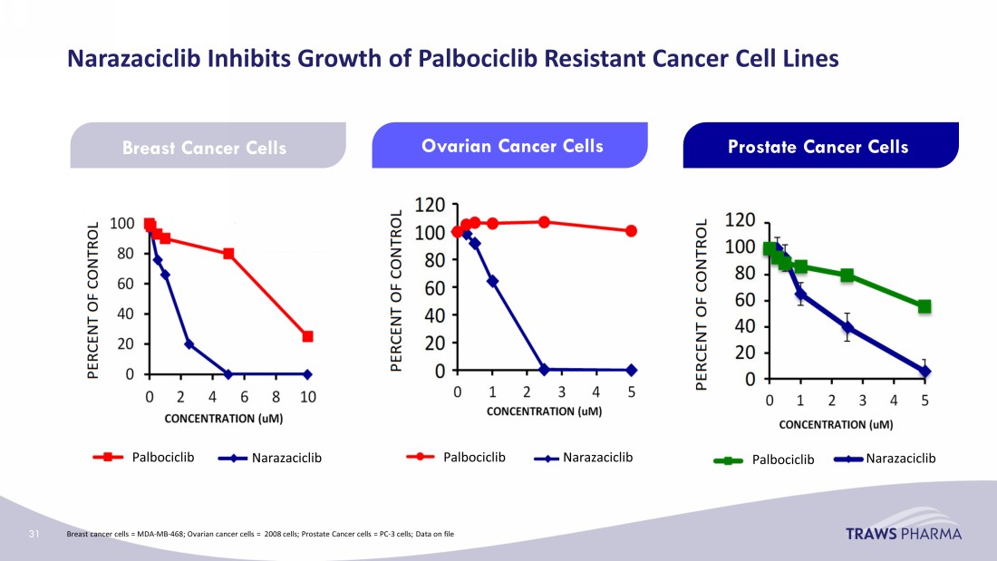 Narazaciclib Inhibits Growth of Palbociclib Resistant Cancer Cell Lines Prostate Cancer Cells Ovarian Cancer Cells Palbociclib Palbociclib Palbociclib Narazaciclib Narazaciclib Narazaciclib Breast Cancer Cells Breast cancer cells = MDA - MB - 468; Ovarian cancer cells = 2008 cells; Prostate Cancer cells = PC - 3 cells; Data on file 31