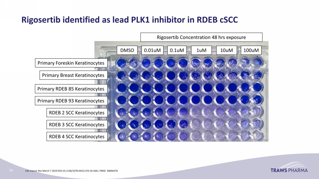 Clin Cancer Res March 7 2019 DOI:10.1158/1078 - 0432.CCR - 18 - 2661. PMID: 30846478 Rigosertib identified as lead PLK1 inhibitor in RDEB cSCC Primary Breast Keratinocytes Primary Foreskin Keratinocytes Primary RDEB 85 Keratinocytes Primary RDEB 93 Keratinocytes RDEB 2 SCC Keratinocytes RDEB 3 SCC Keratinocytes RDEB 4 SCC Keratinocytes DMSO 0.01uM 0.1uM 1uM 10uM 100uM Rigosertib Concentration 48 hrs exposure 33
